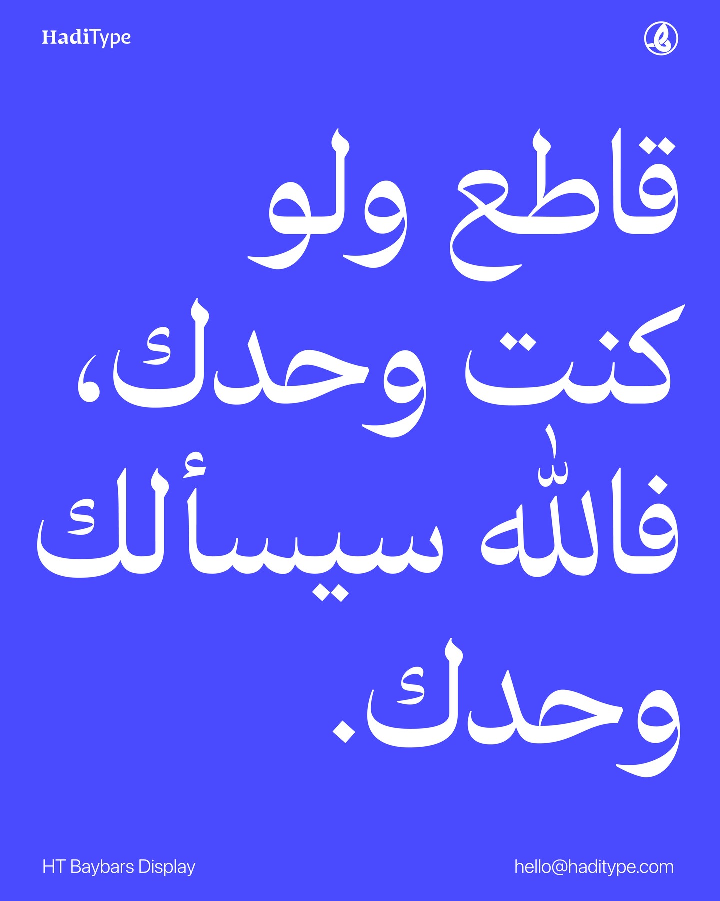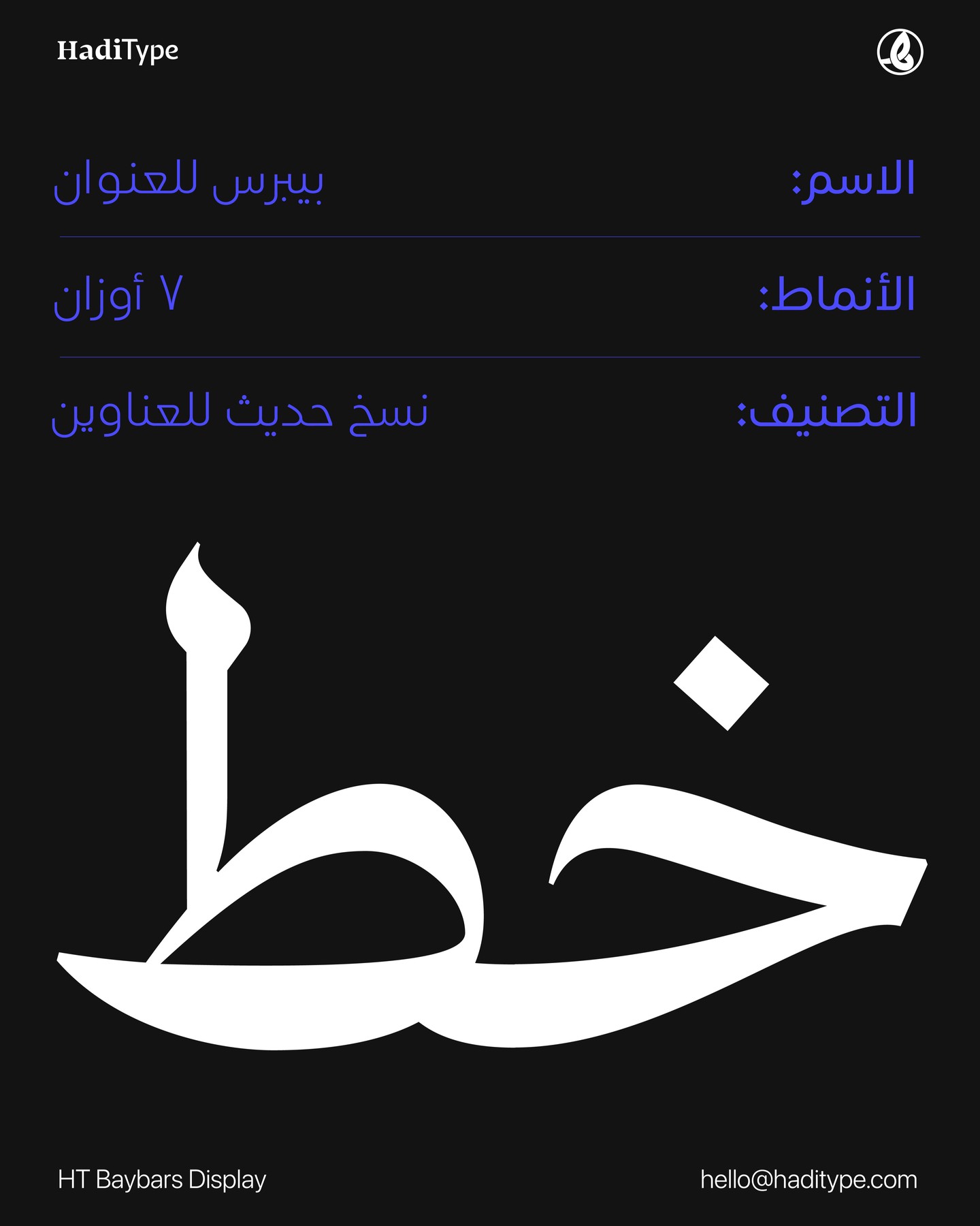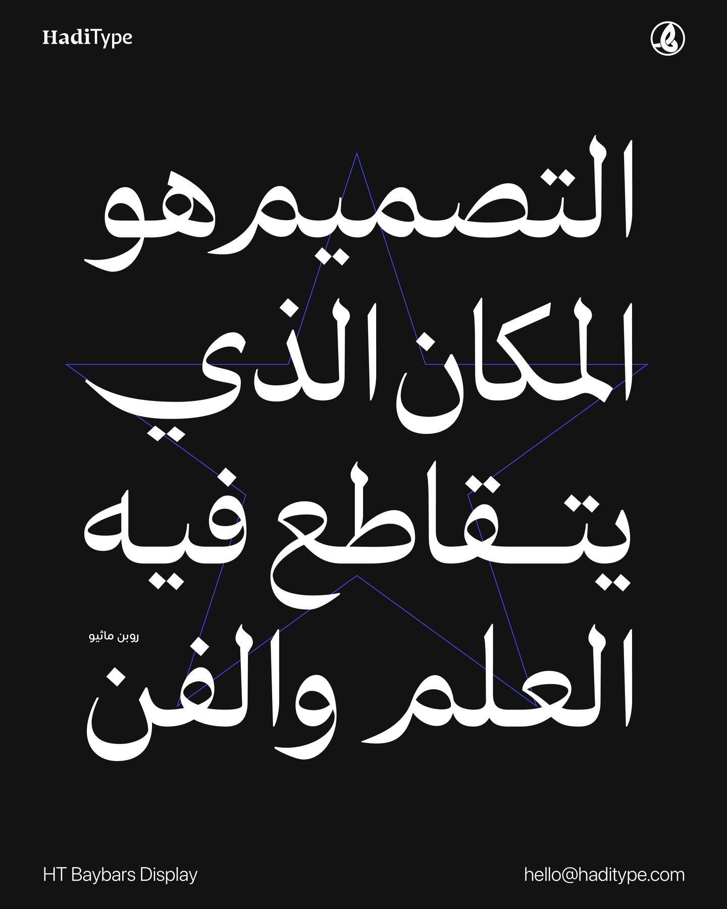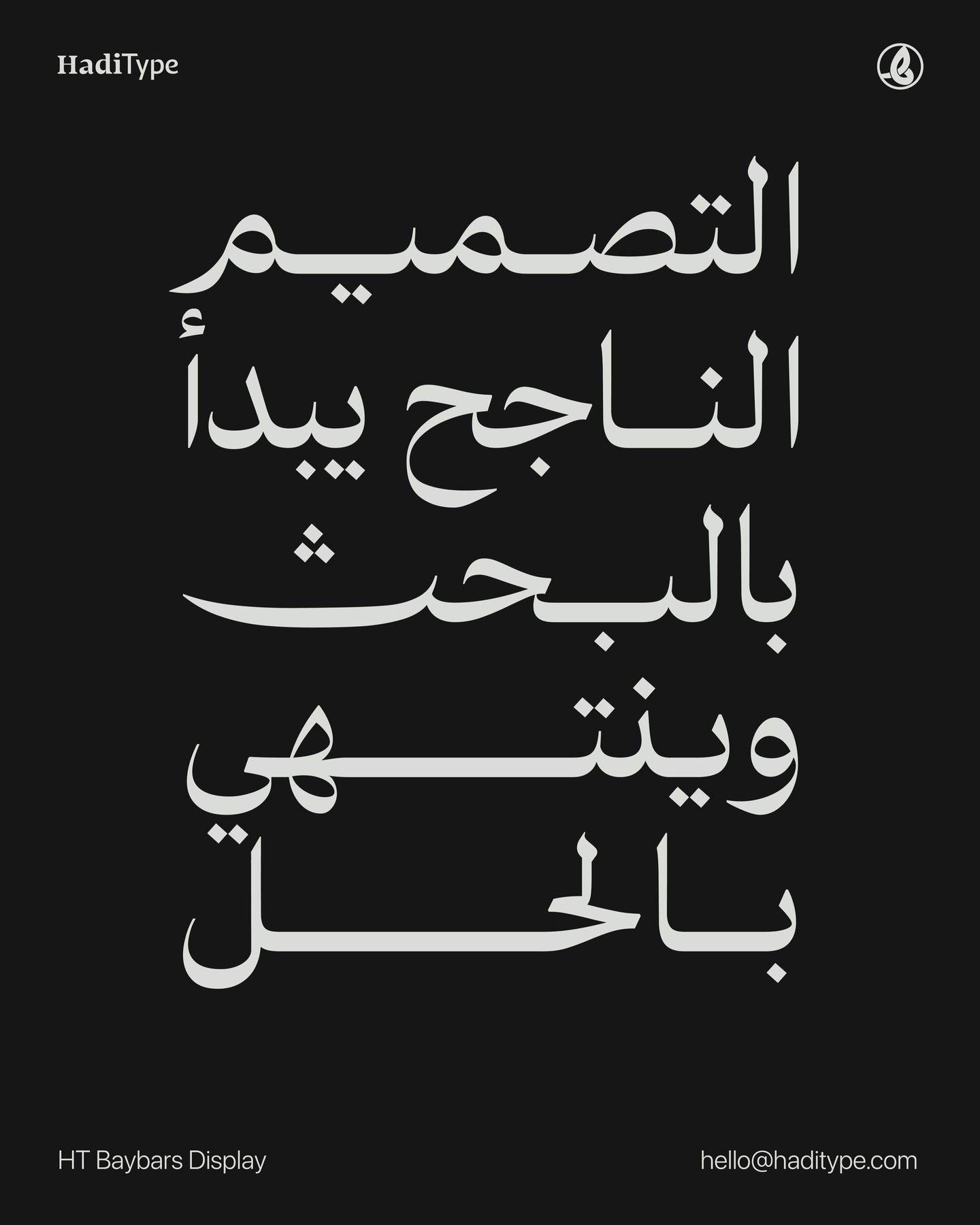 Baybars Display is an integral component of the comprehensive Baybars type system. This refined and dynamic Naskh typeface seamlessly integrates various unique elements with timeless forms, making it a perfect choice for magazine editorials, titles, and beyond.