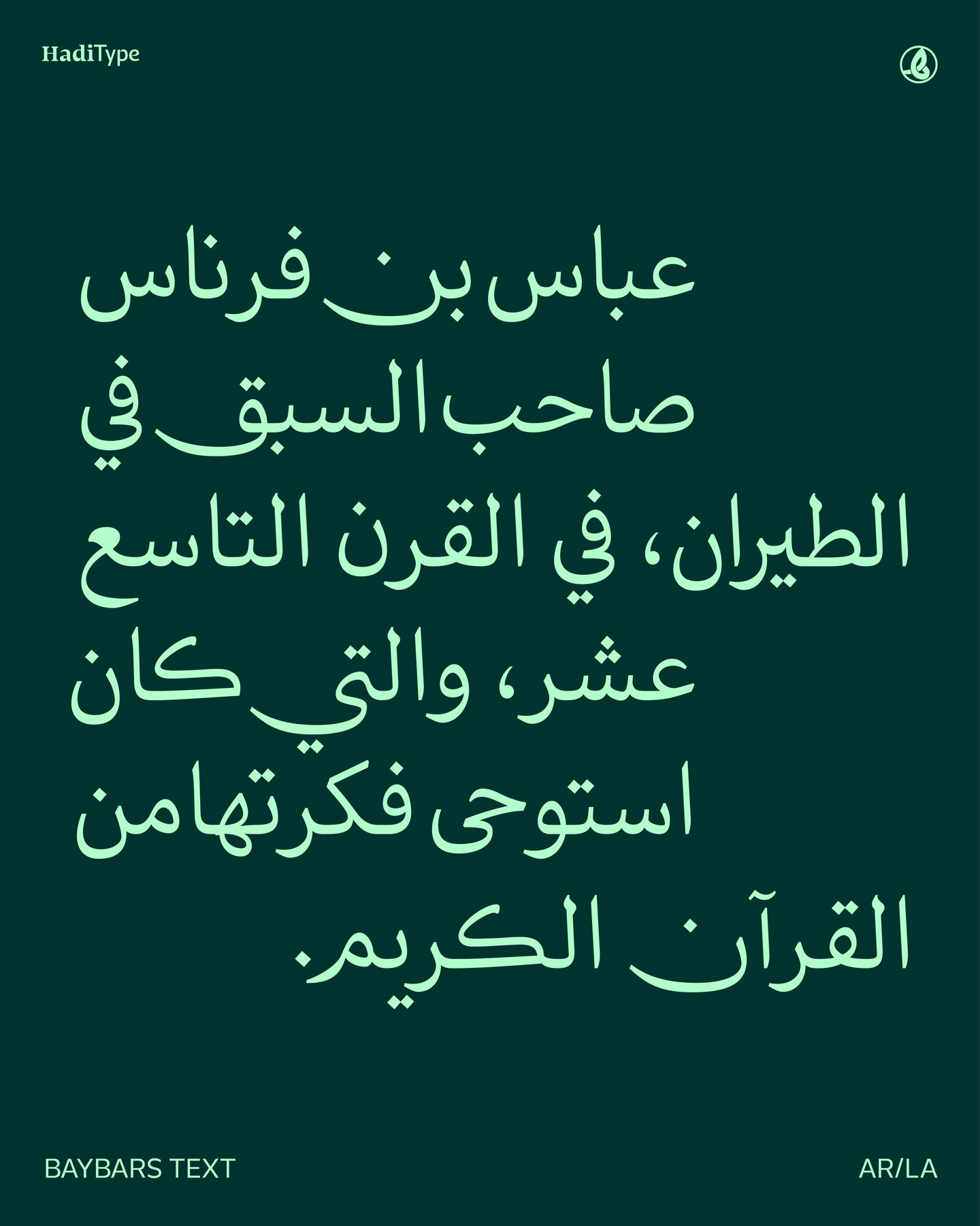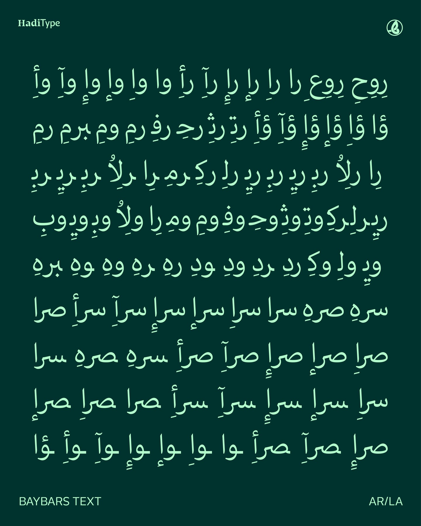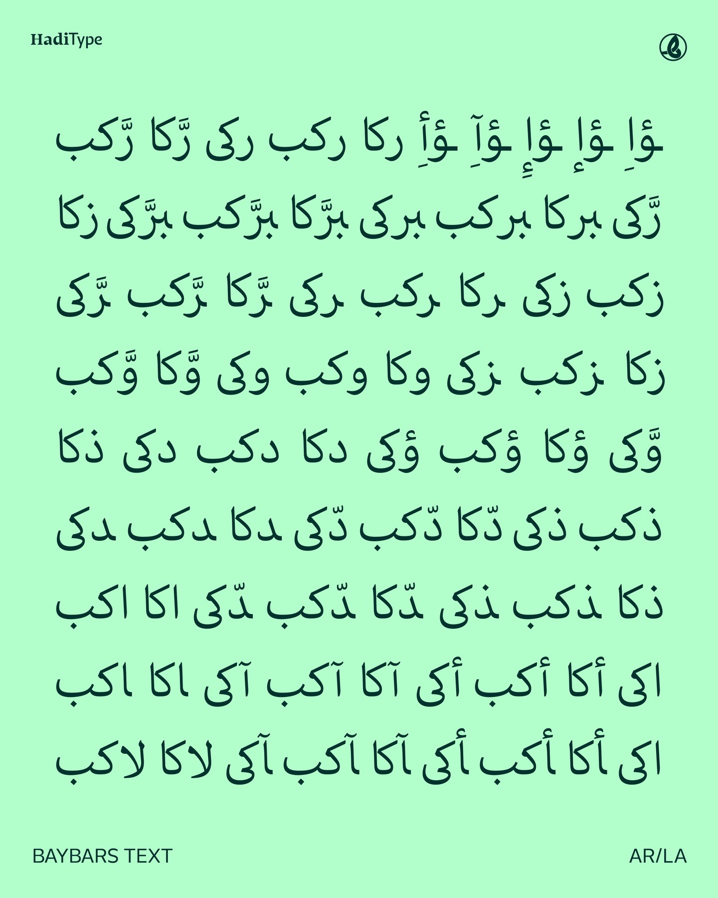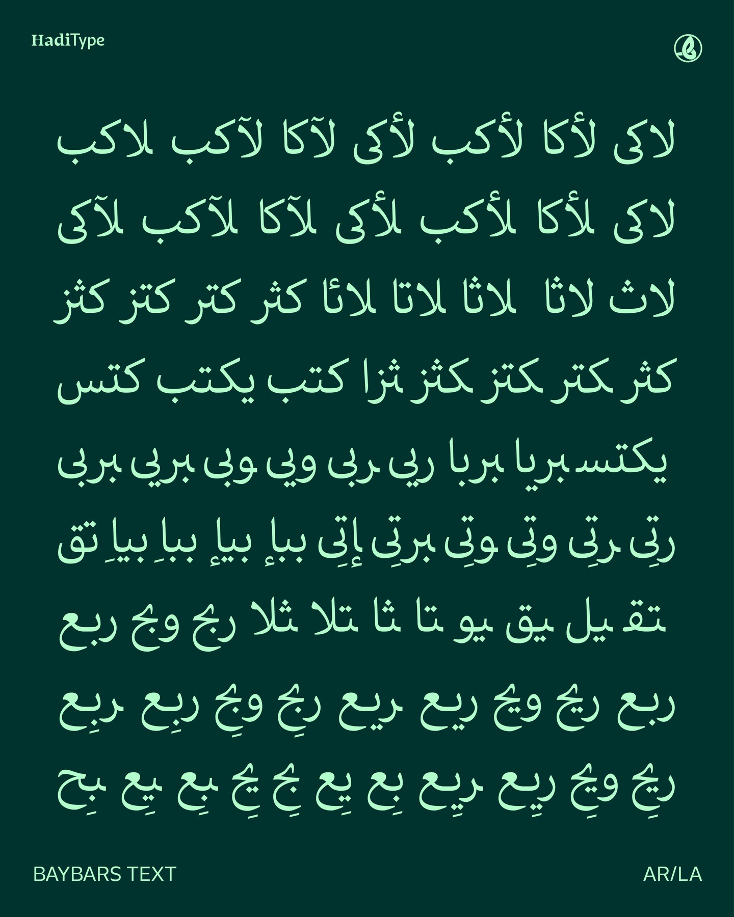 Baybars Text Font is the culmination of extensive research on classic Arabic typographic designs that I have worked on for a long time. I aim to offer a unique tool for enthusiasts of Naskh fonts specifically and text fonts in general. "Baybars Text strikes a balance between purely traditional handmade scripts and strictly geometric fonts with their well-known proportions and precision.