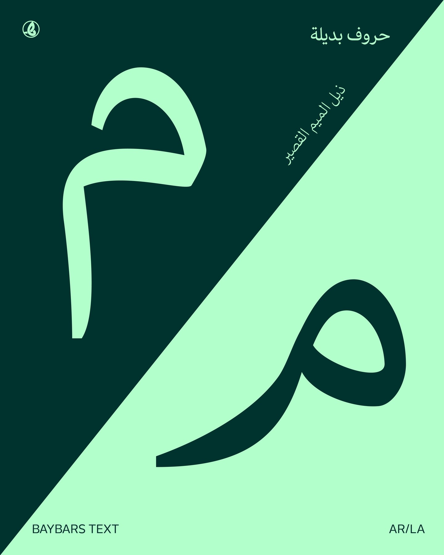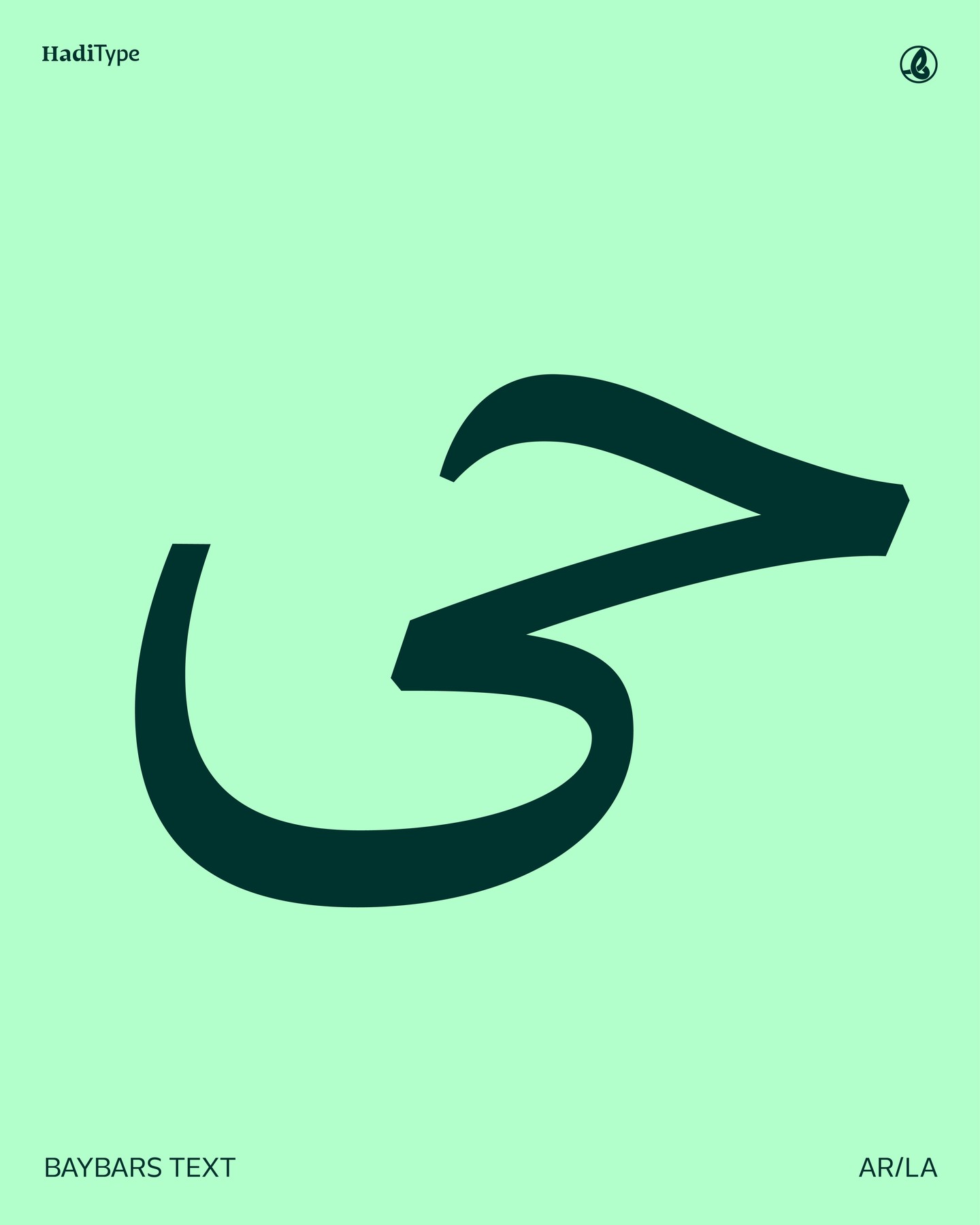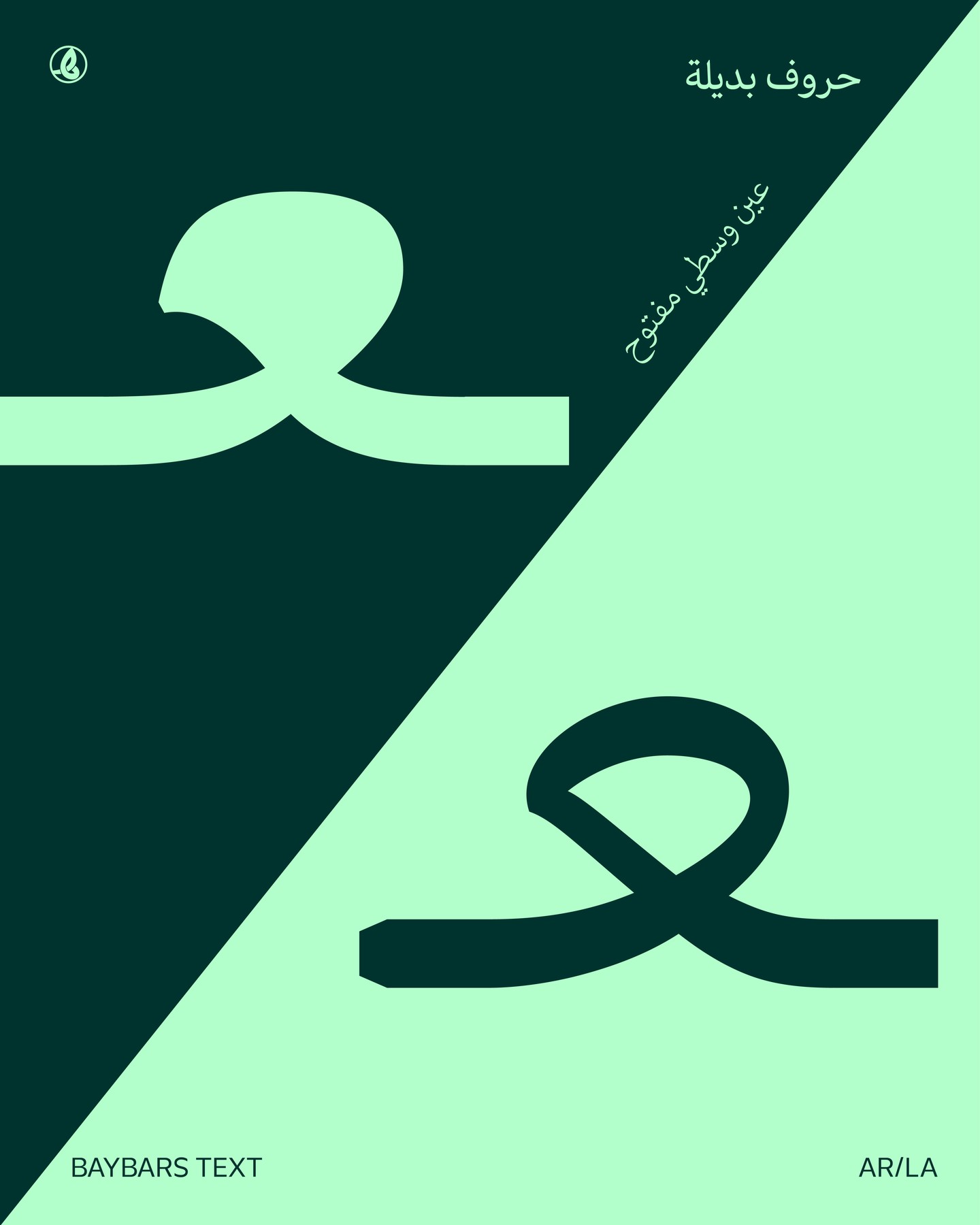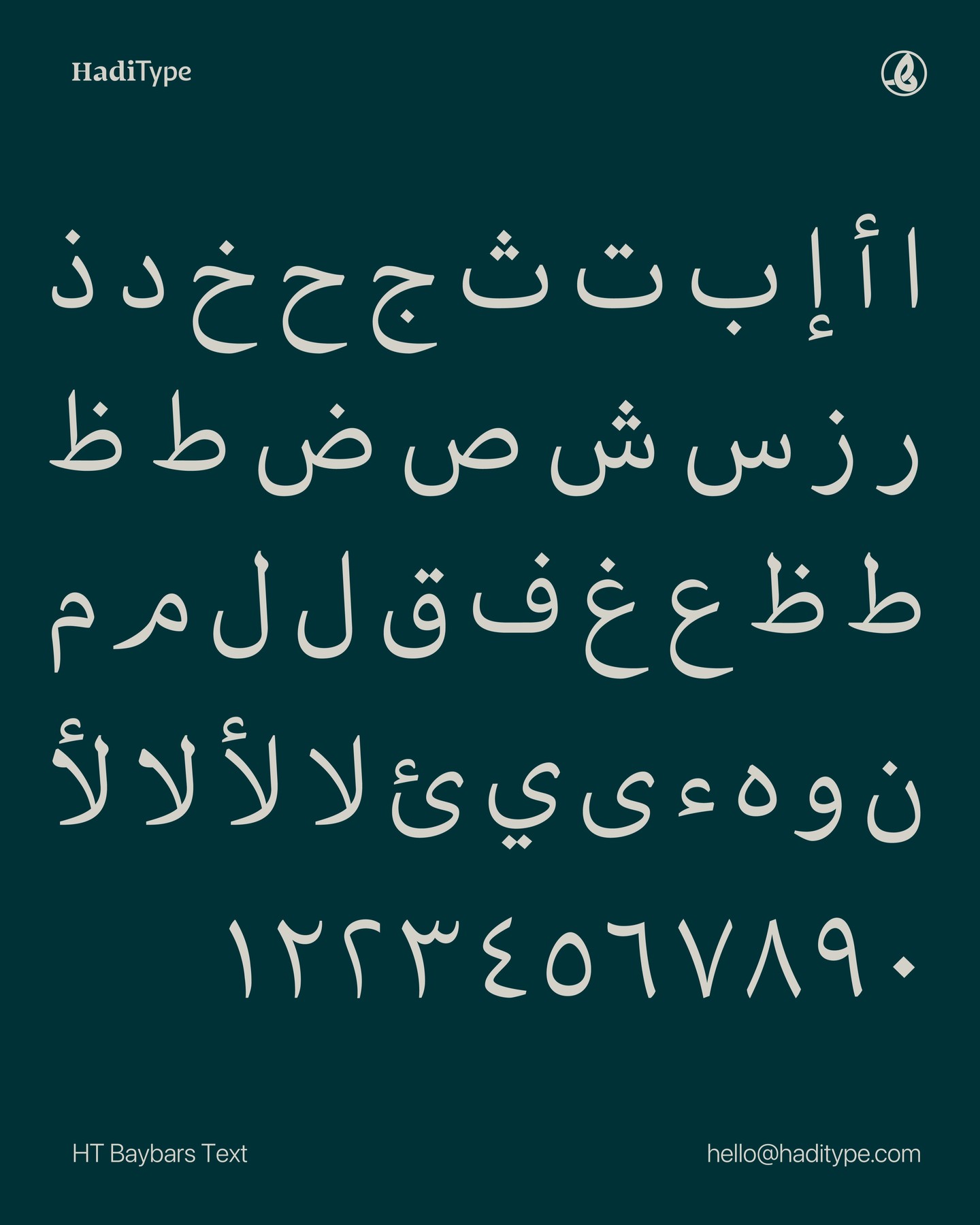 The font is based on two main directions: a serif and a sans-serif style, allowing users to alter the font’s personality easily. It also includes several distinctive alternative glyphs such as the open ‘Ain and Ghain, the extended Meem, and the Zandari-style Kaf, along with a curved alternative shape for the Indian numeral 2. This makes "Baybars Text" an ideal choice for use in magazines, books, branding, and bilingual projects.