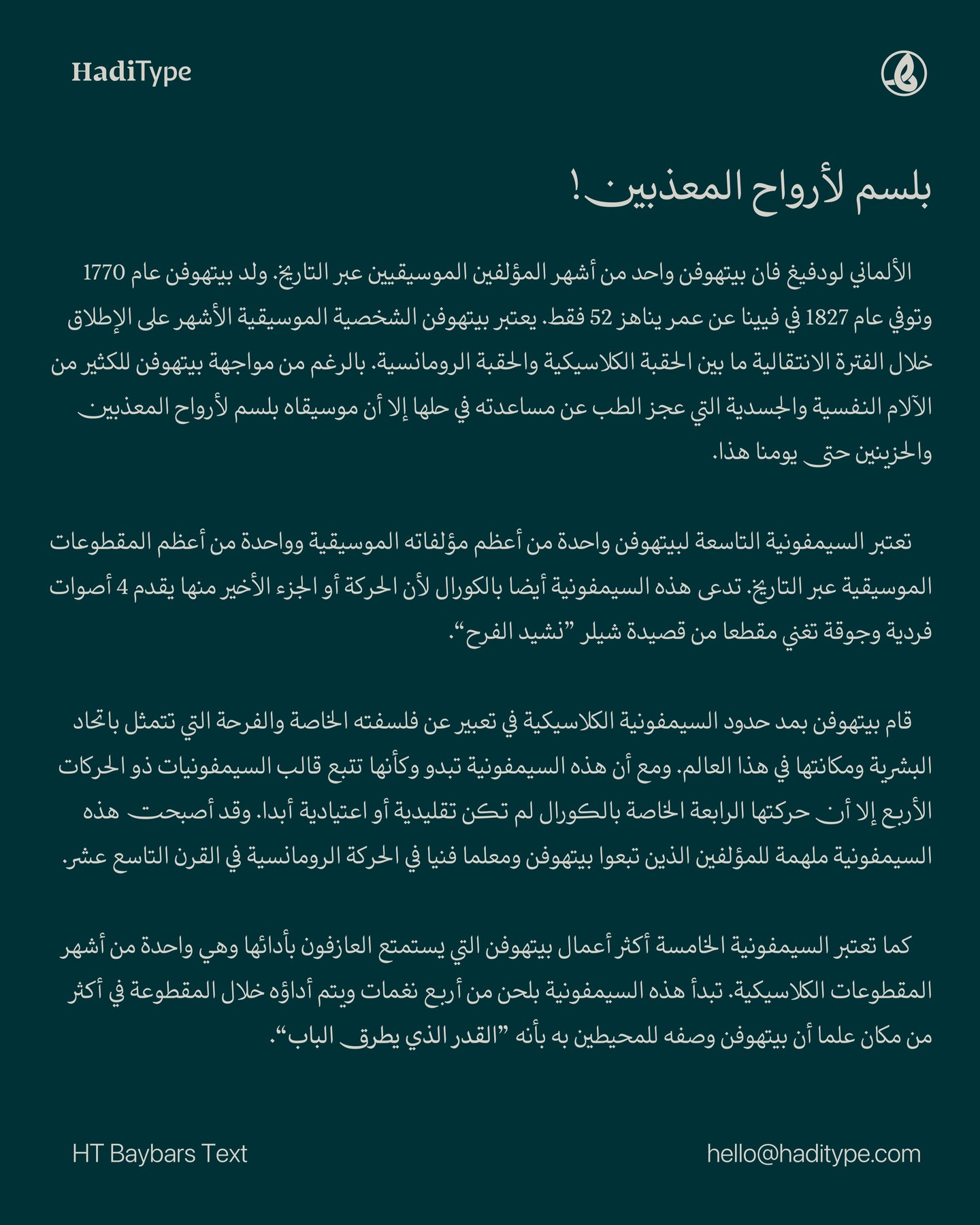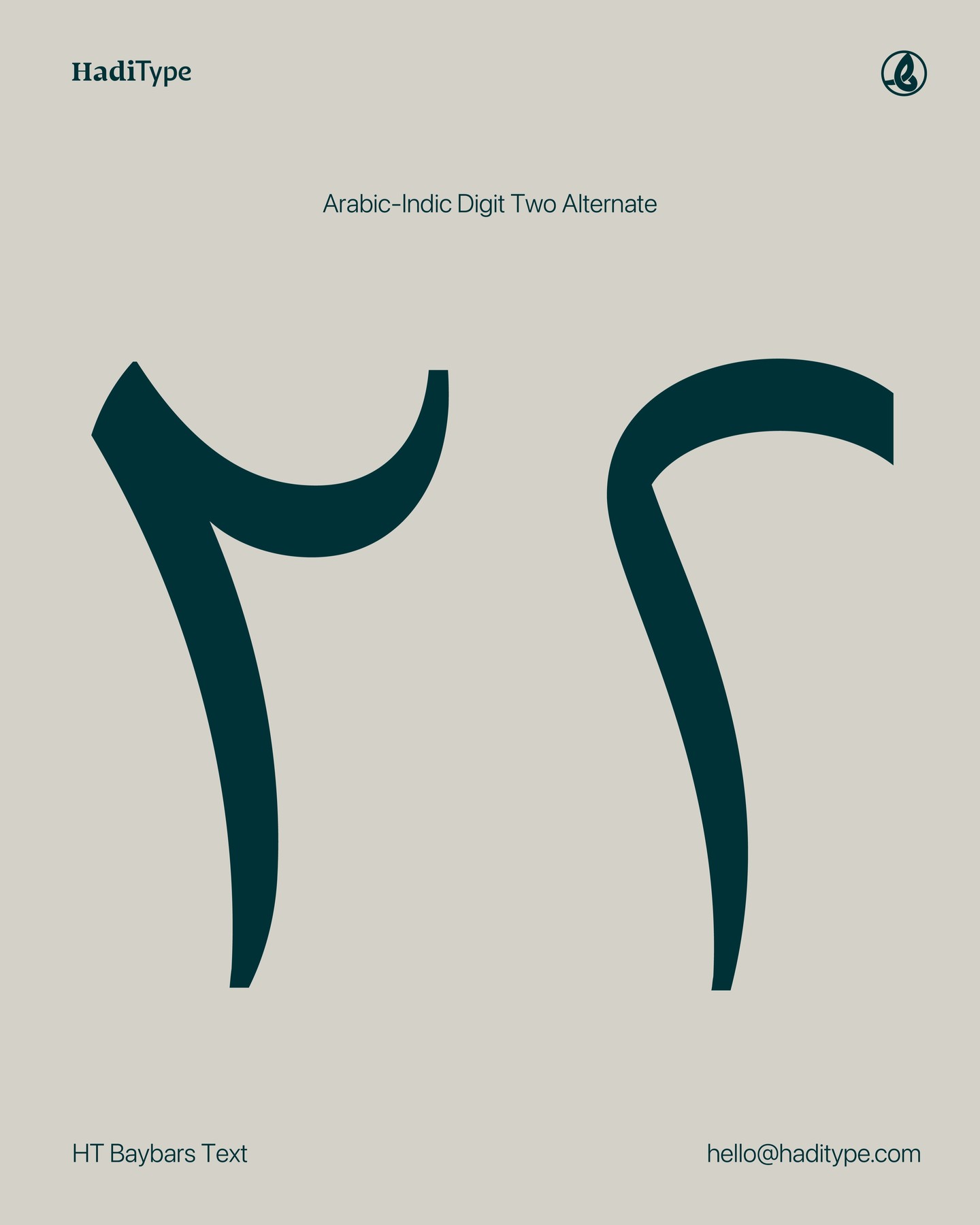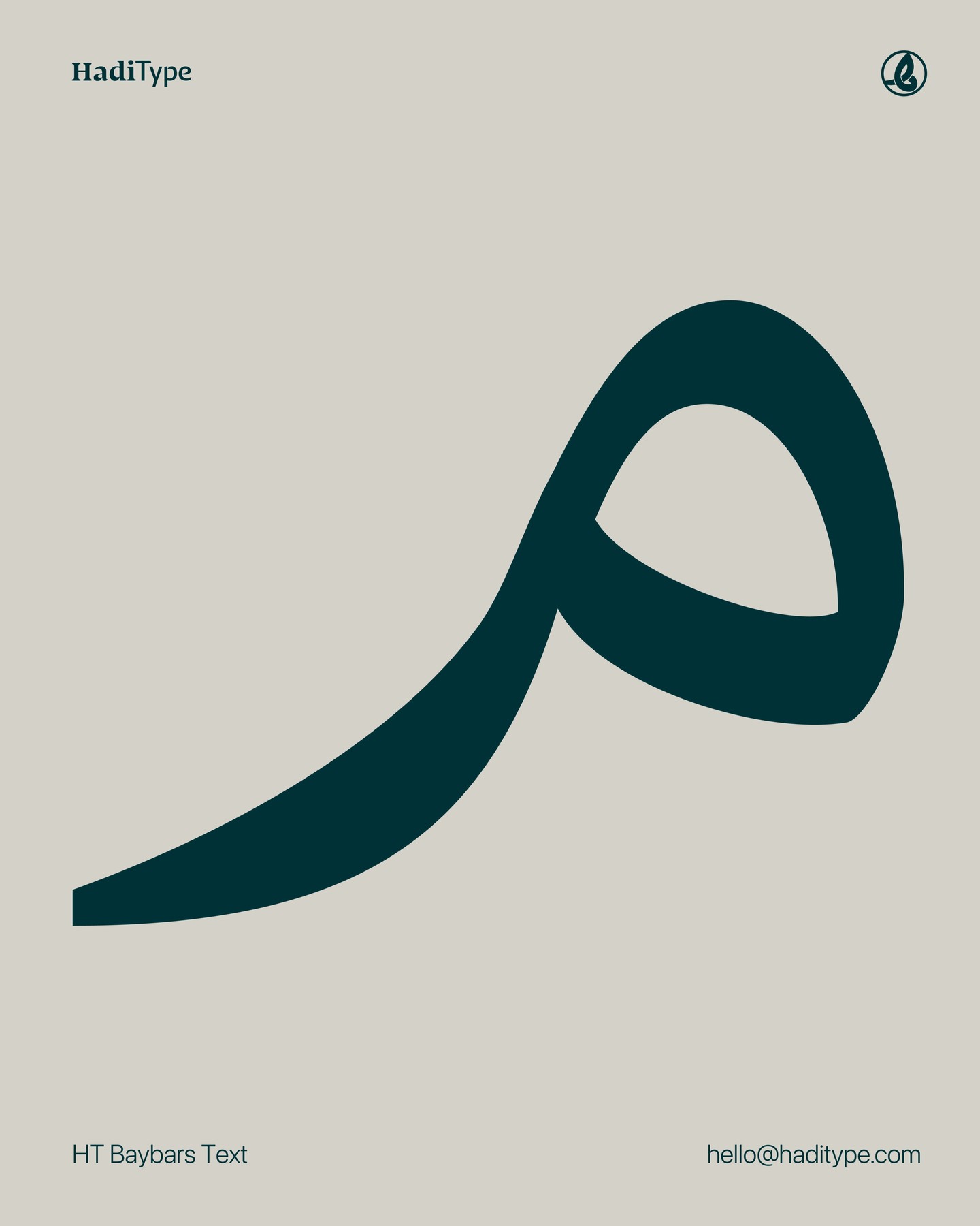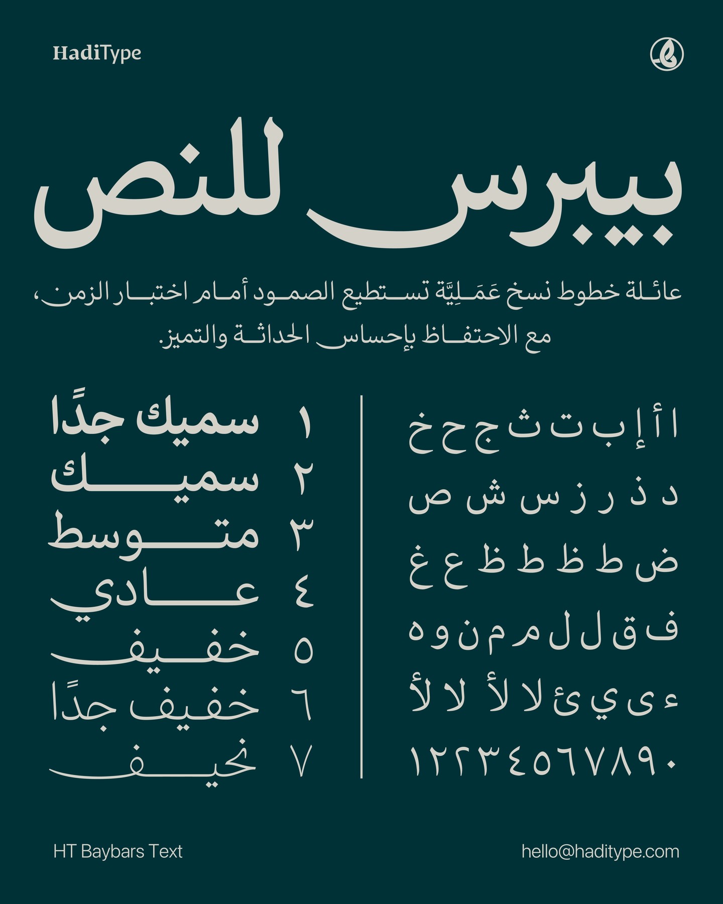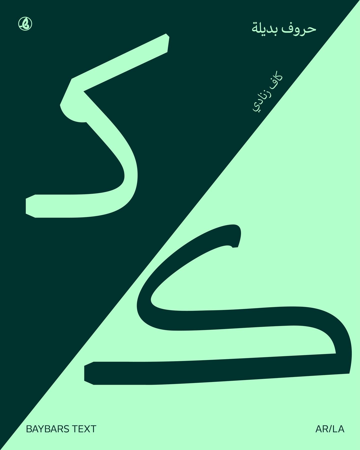 The font is based on two main directions: a serif and a sans-serif style, allowing users to alter the font’s personality easily. It also includes several distinctive alternative glyphs such as the open ‘Ain and Ghain, the extended Meem, and the Zandari-style Kaf, along with a curved alternative shape for the Indian numeral 2. This makes "Baybars Text" an ideal choice for use in magazines, books, branding, and bilingual projects.