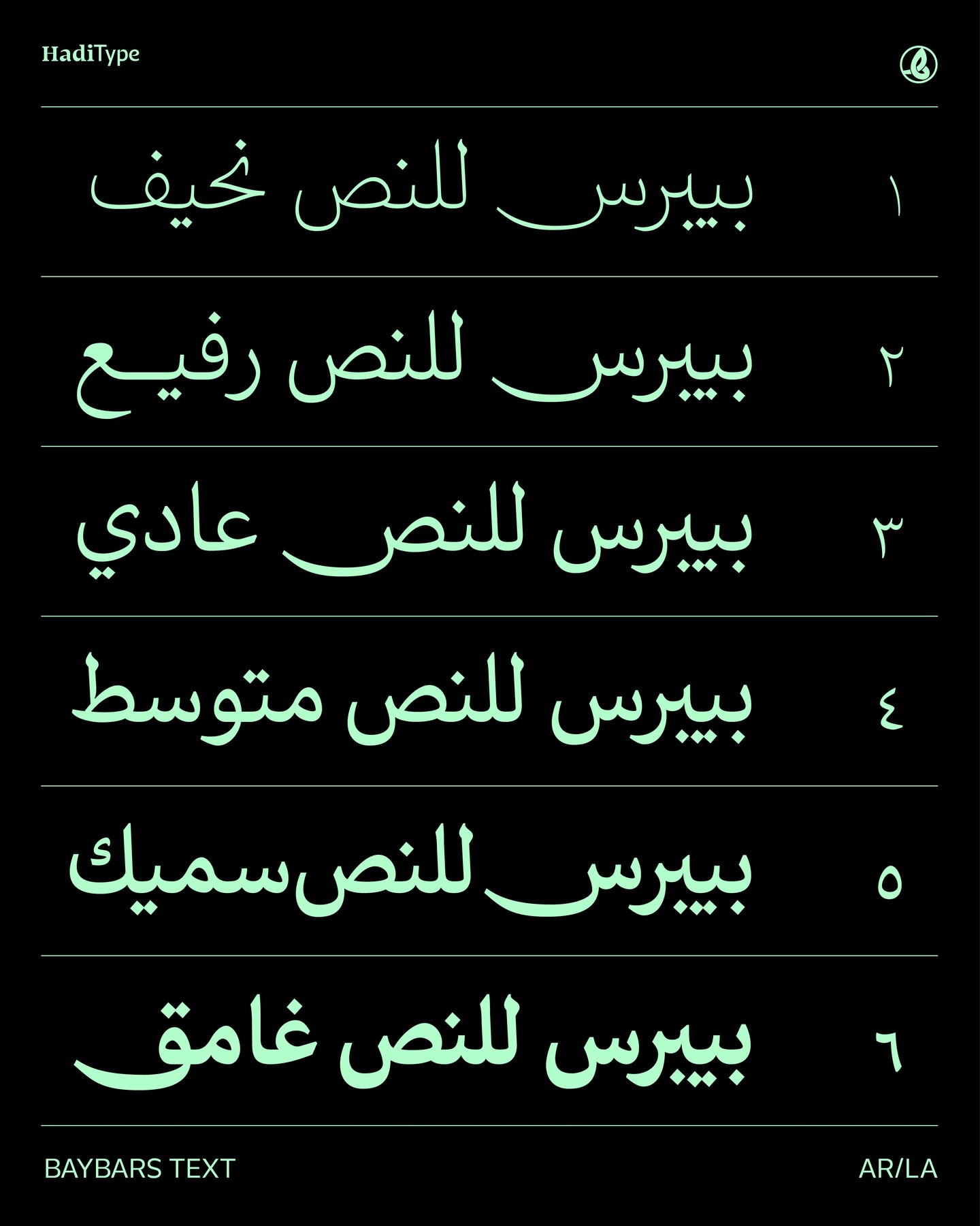 We have included some rarely offered weights in the text font family to give designers greater flexibility. In addition to the usual thin, light, regular, medium, and bold weights, "Baybars Text" also offers a fine and extra weight. The font supports Persian, Urdu, Maghrebi Arabic, and North African Arabic and includes Latin letters specifically designed to harmonize with the Latin and Arabic scripts.