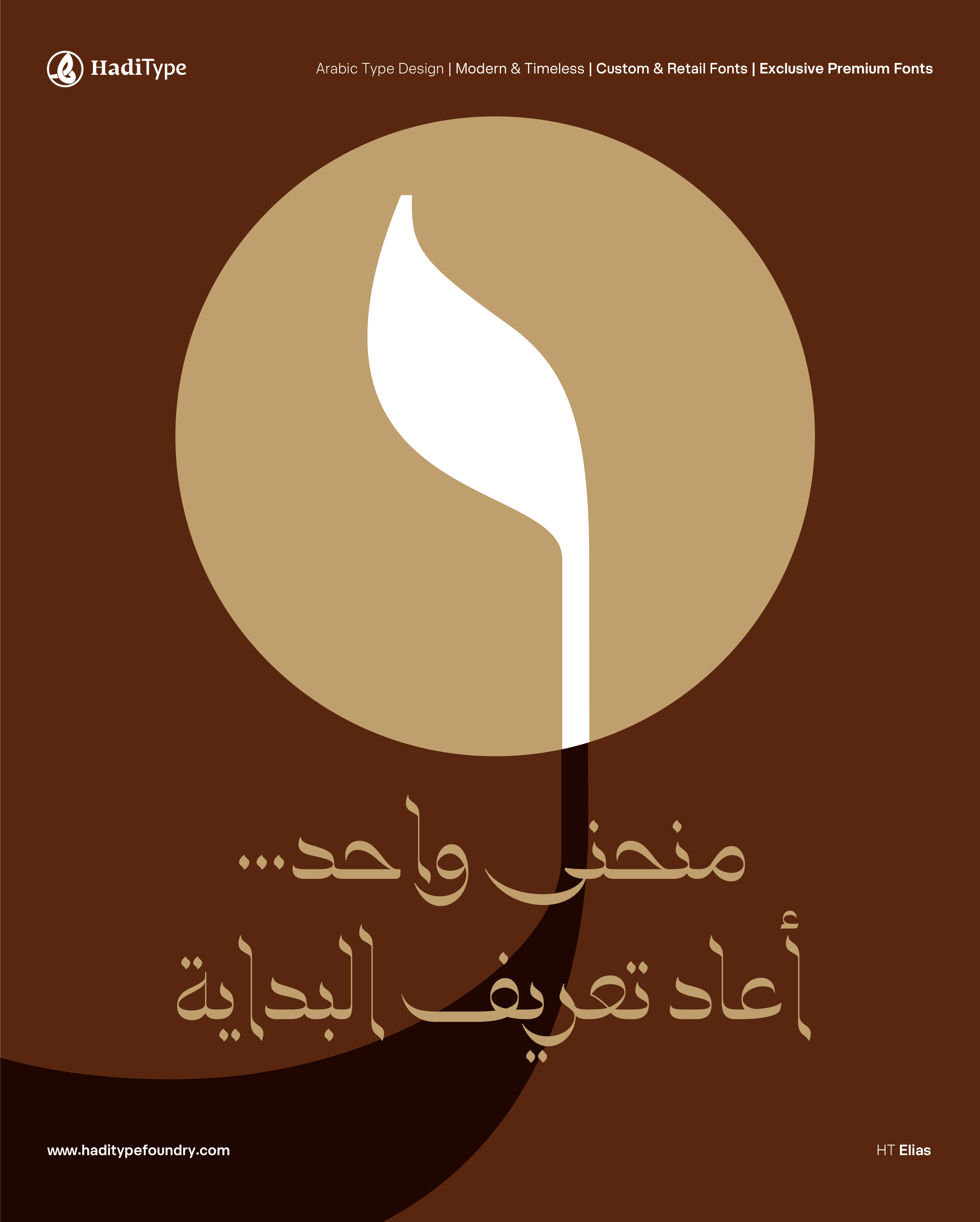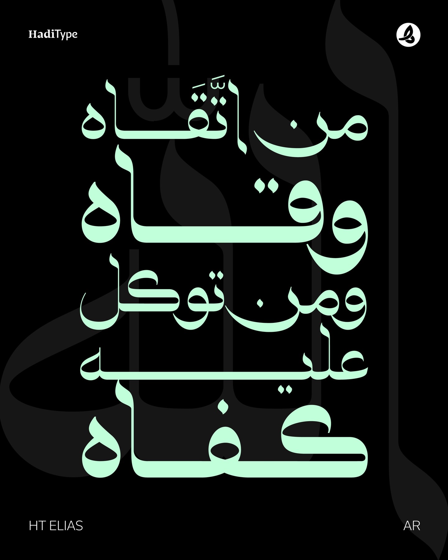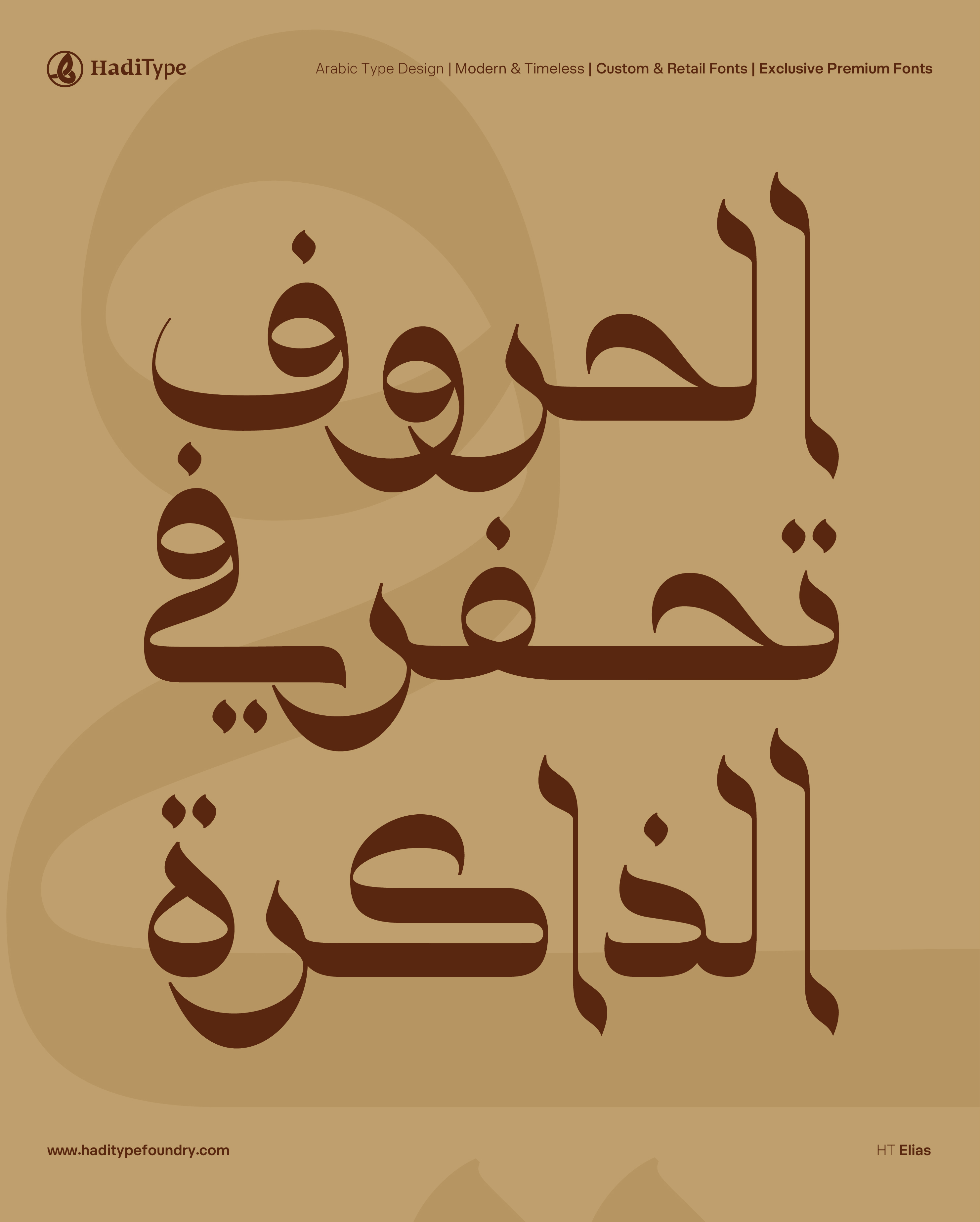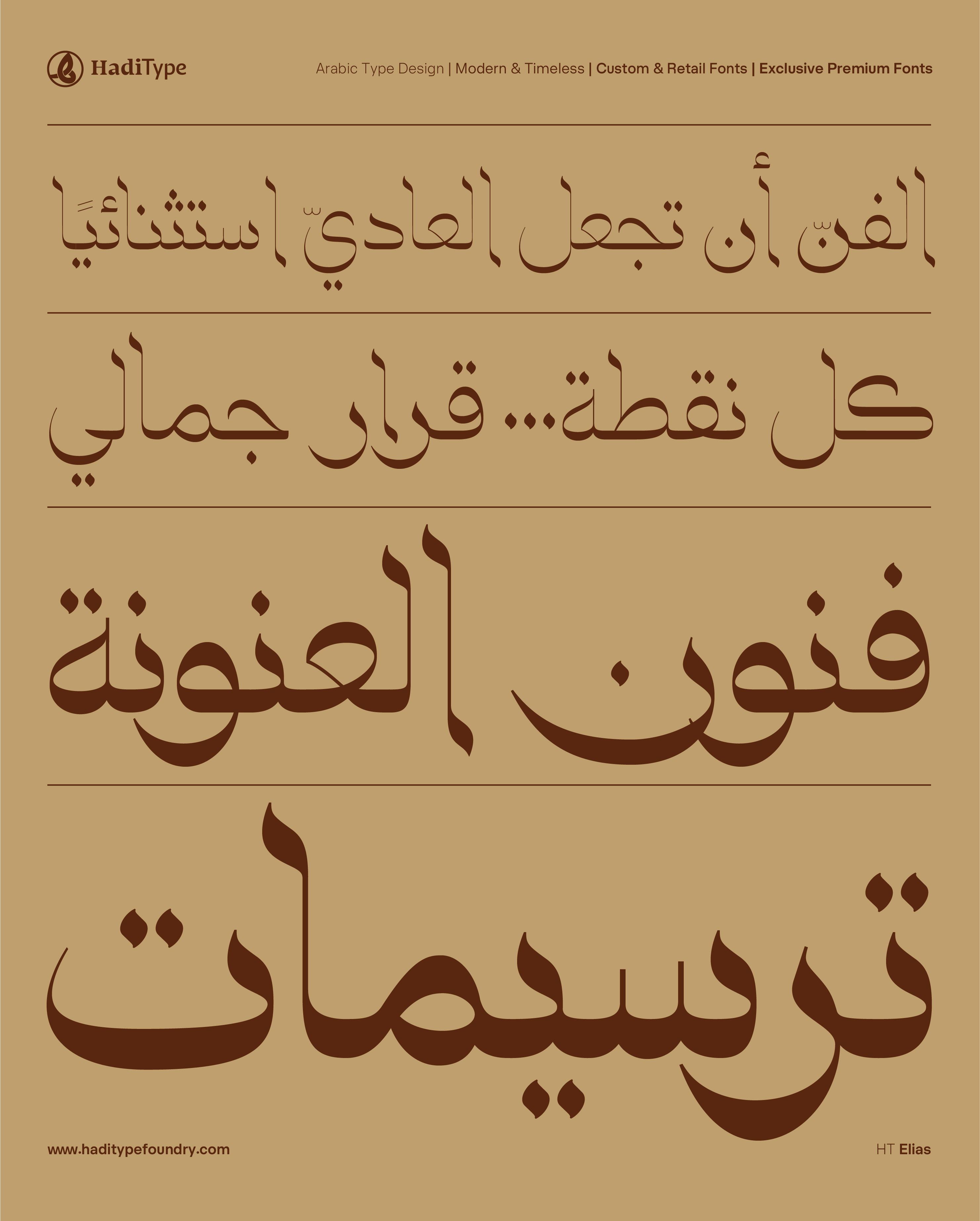 Elegant and confident, HT Elias is a bold Arabic display typeface by Hadi Type Foundry, blending heritage with modern precision.Inspired by the Nishabouri Kufic manuscript, it revives the sharp vertical rhythm and strong geometric balance of that early calligraphic style.Designed for impactful headlines, posters, and brand identities, Elyas reduces excessive white space to form compact, architectural word blocks. Through reversed contrast, most of the weight shifts to the upper and lower tarwees, creating a distinctive rhythm that feels sculpted rather than written.Available in six weights — from Thin to Heavy — offering flexibility across expressive display settings and refined typographic compositions.HT Elyas — Where Kufic heritage meets contemporary clarity.