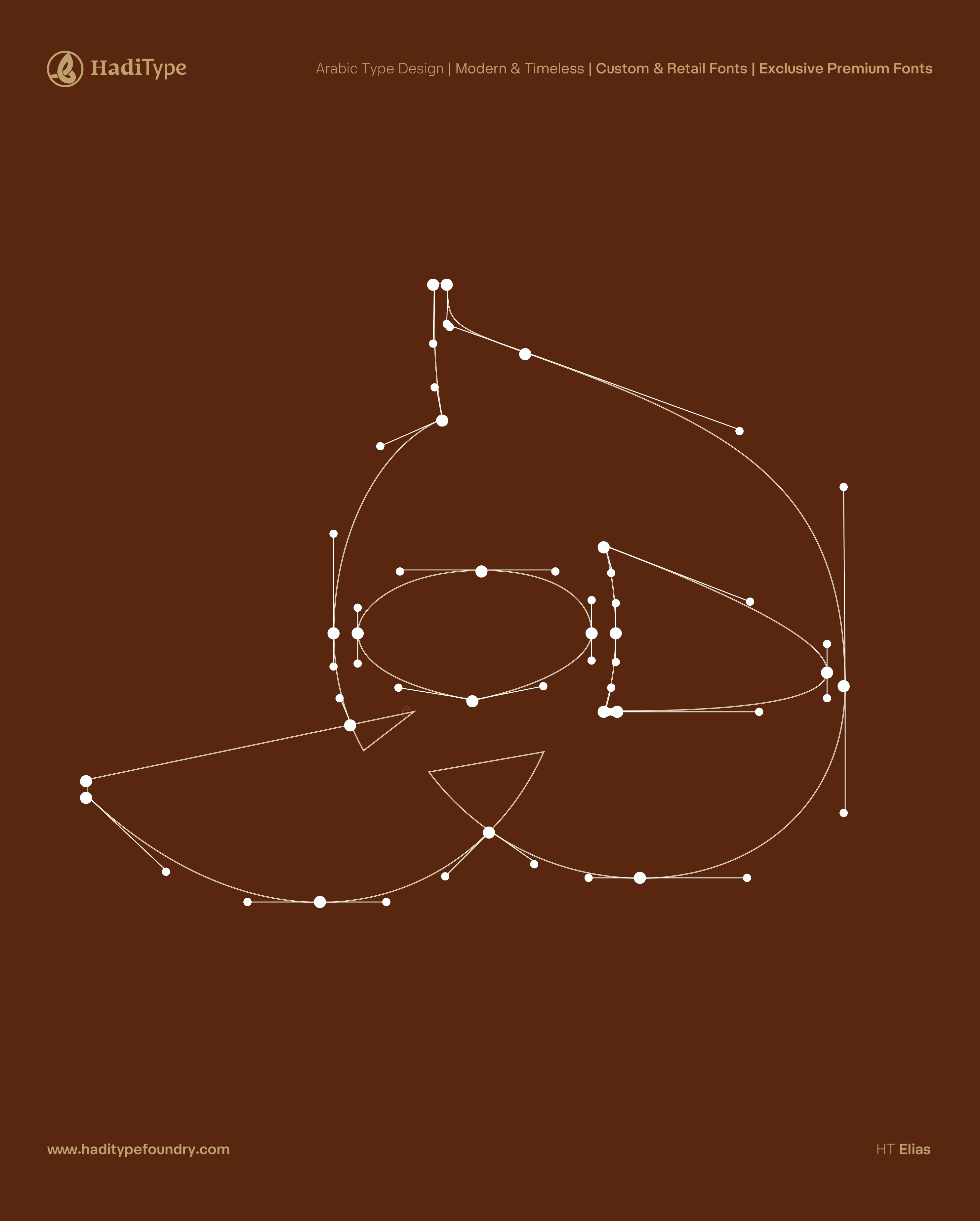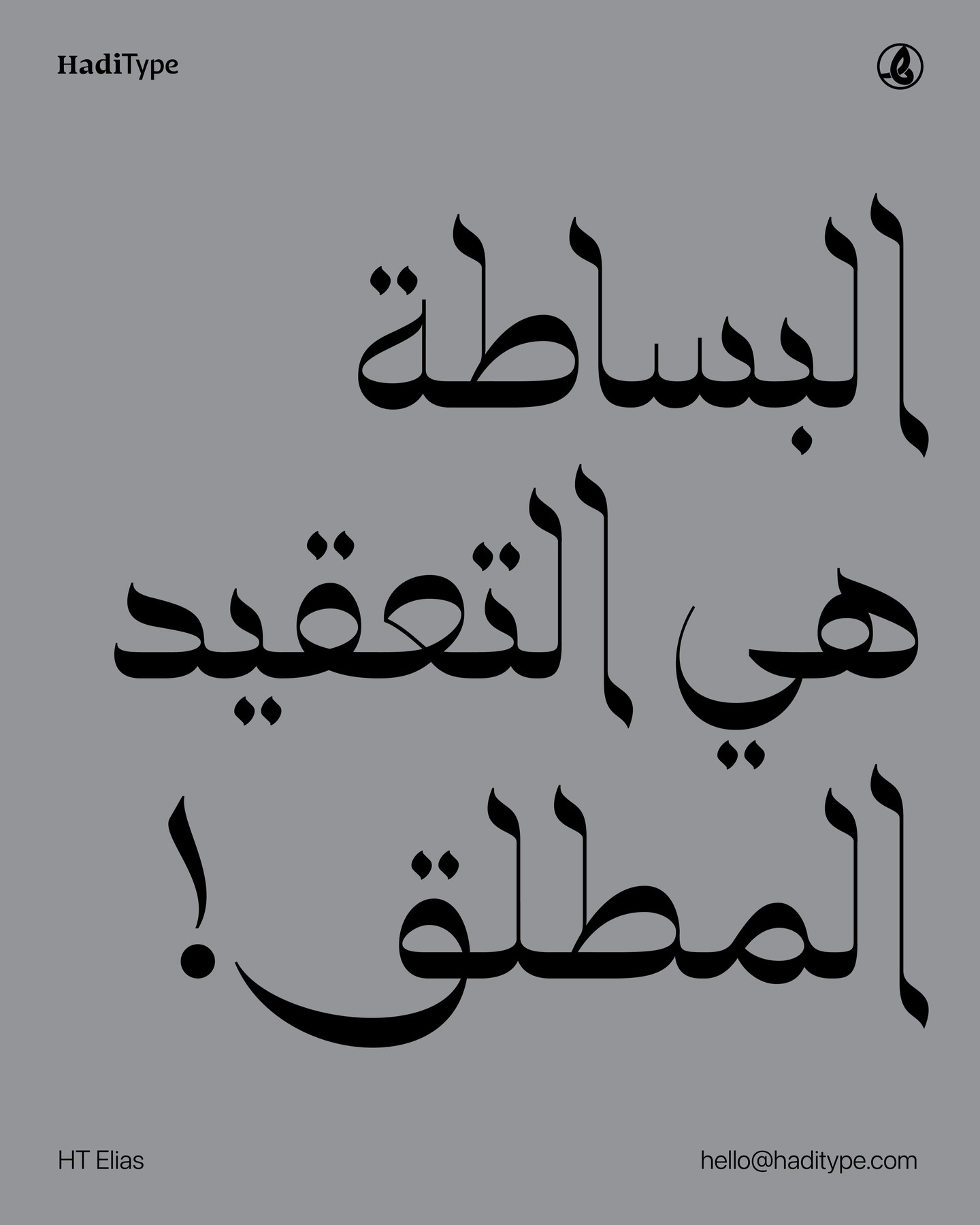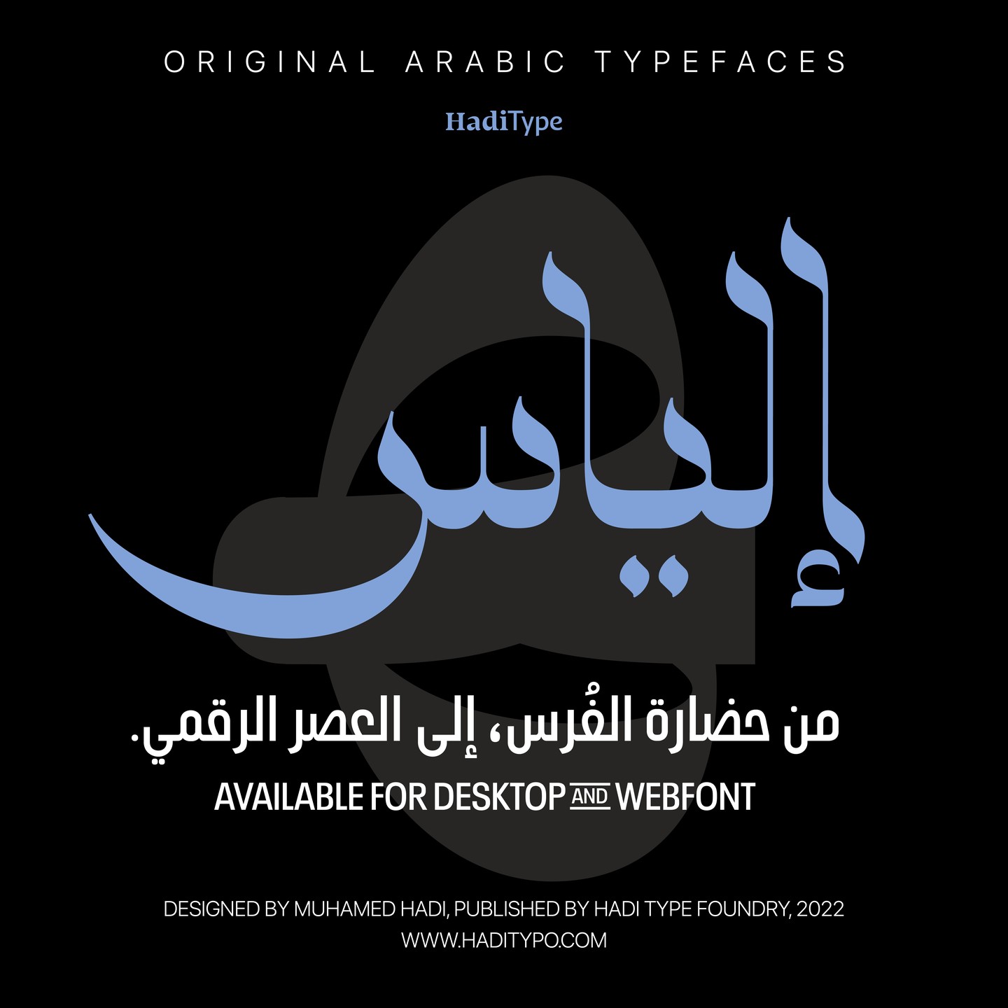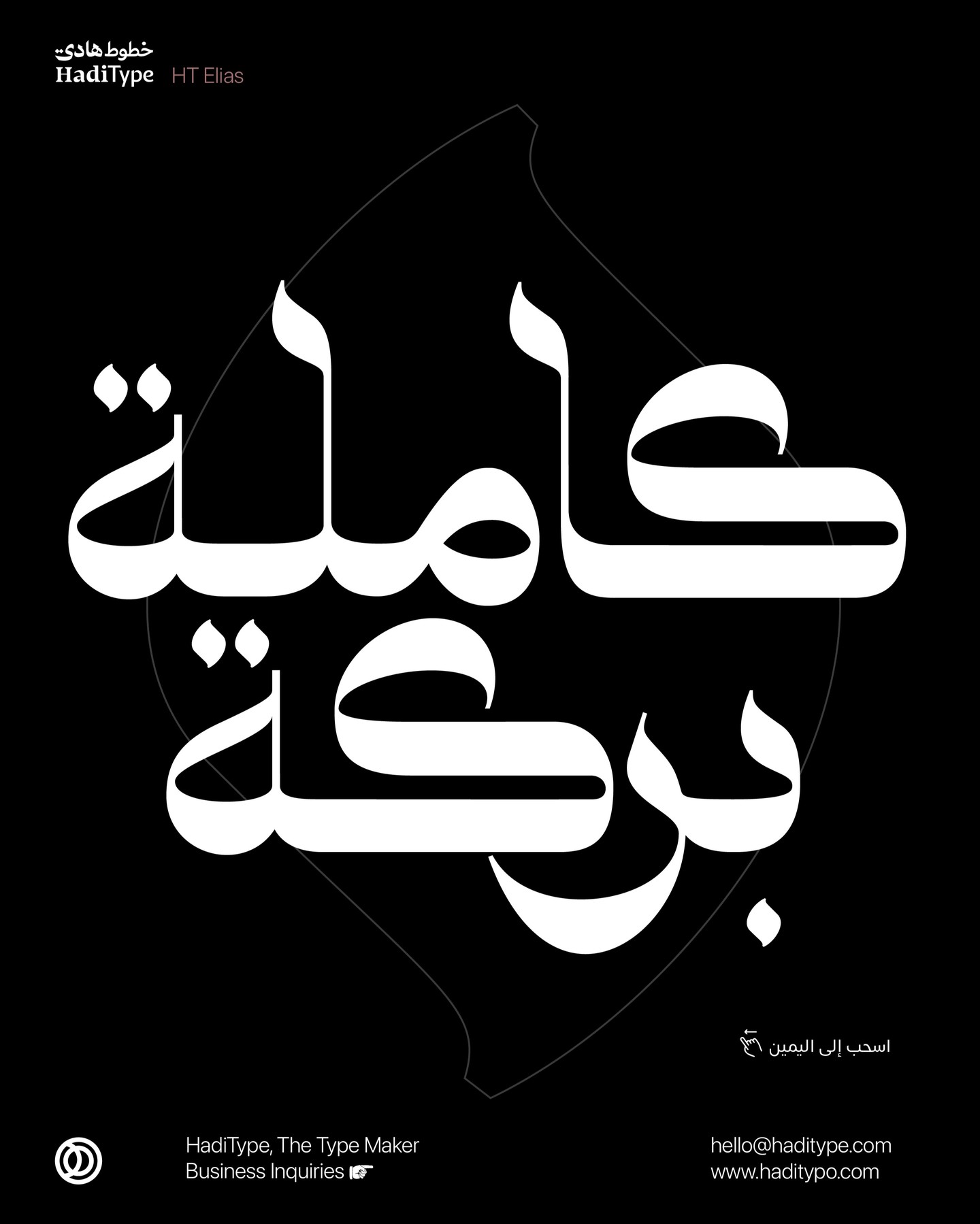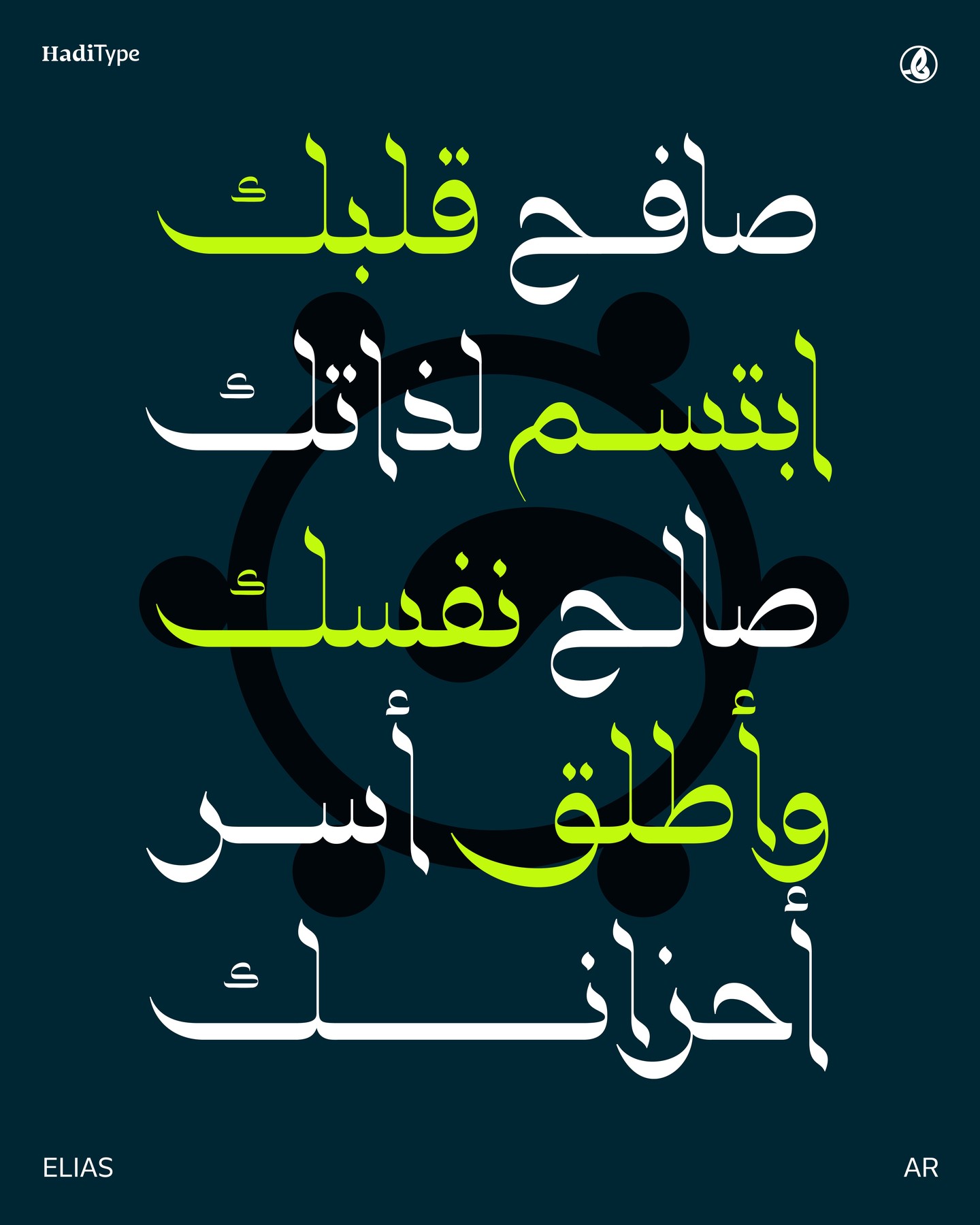 Elegant and confident, HT Elias is a bold Arabic display typeface by Hadi Type Foundry, blending heritage with modern precision.Inspired by the Nishabouri Kufic manuscript, it revives the sharp vertical rhythm and strong geometric balance of that early calligraphic style.Designed for impactful headlines, posters, and brand identities, Elyas reduces excessive white space to form compact, architectural word blocks. Through reversed contrast, most of the weight shifts to the upper and lower tarwees, creating a distinctive rhythm that feels sculpted rather than written.Available in six weights — from Thin to Heavy — offering flexibility across expressive display settings and refined typographic compositions.HT Elyas — Where Kufic heritage meets contemporary clarity.