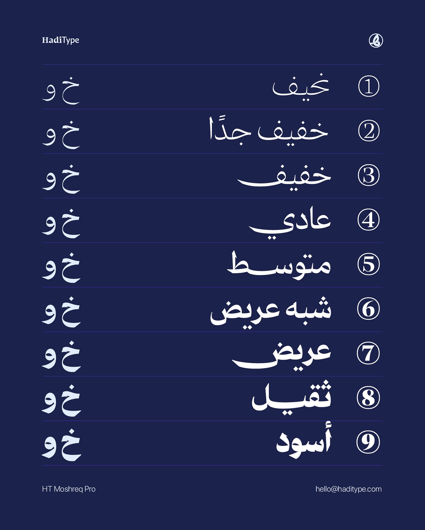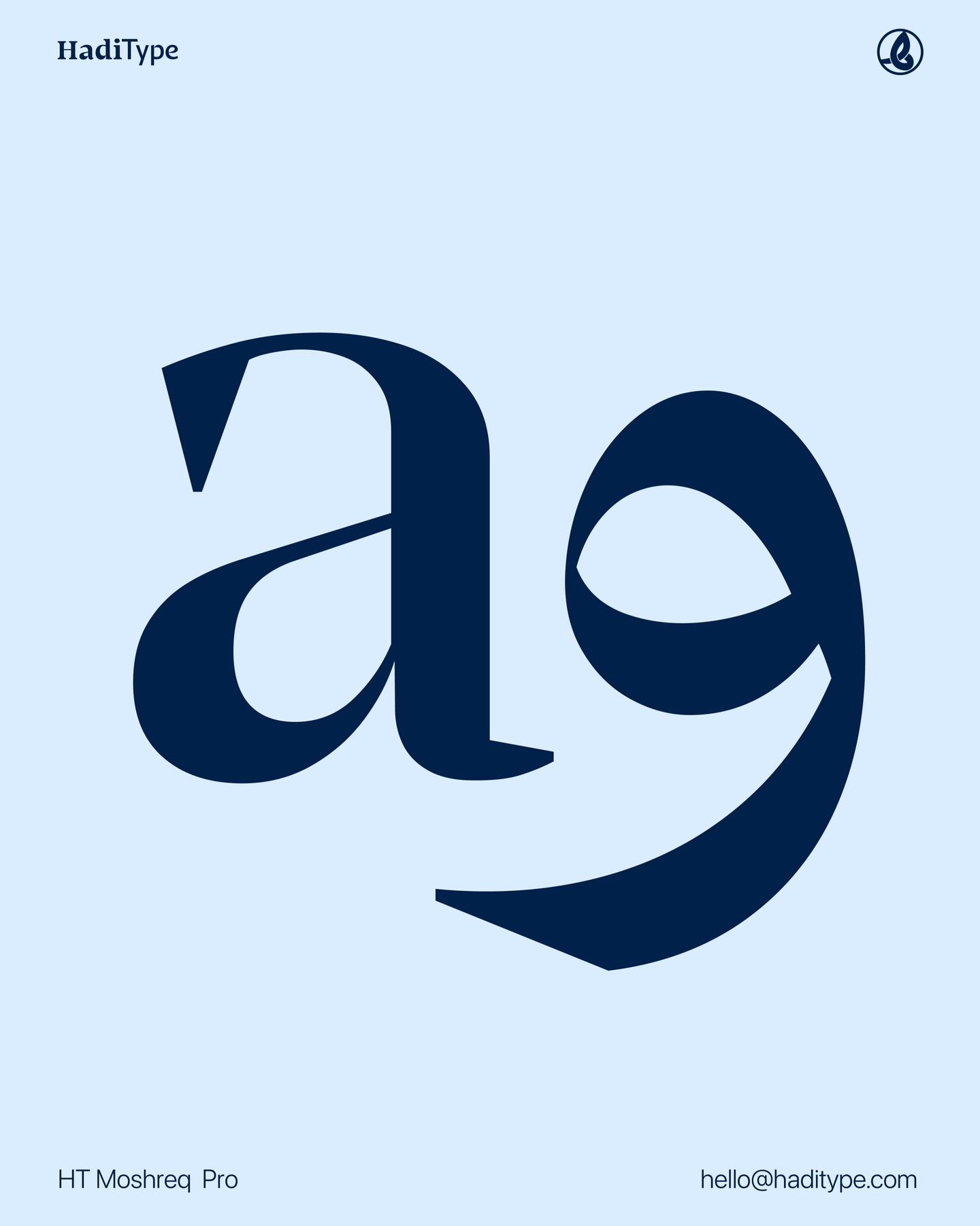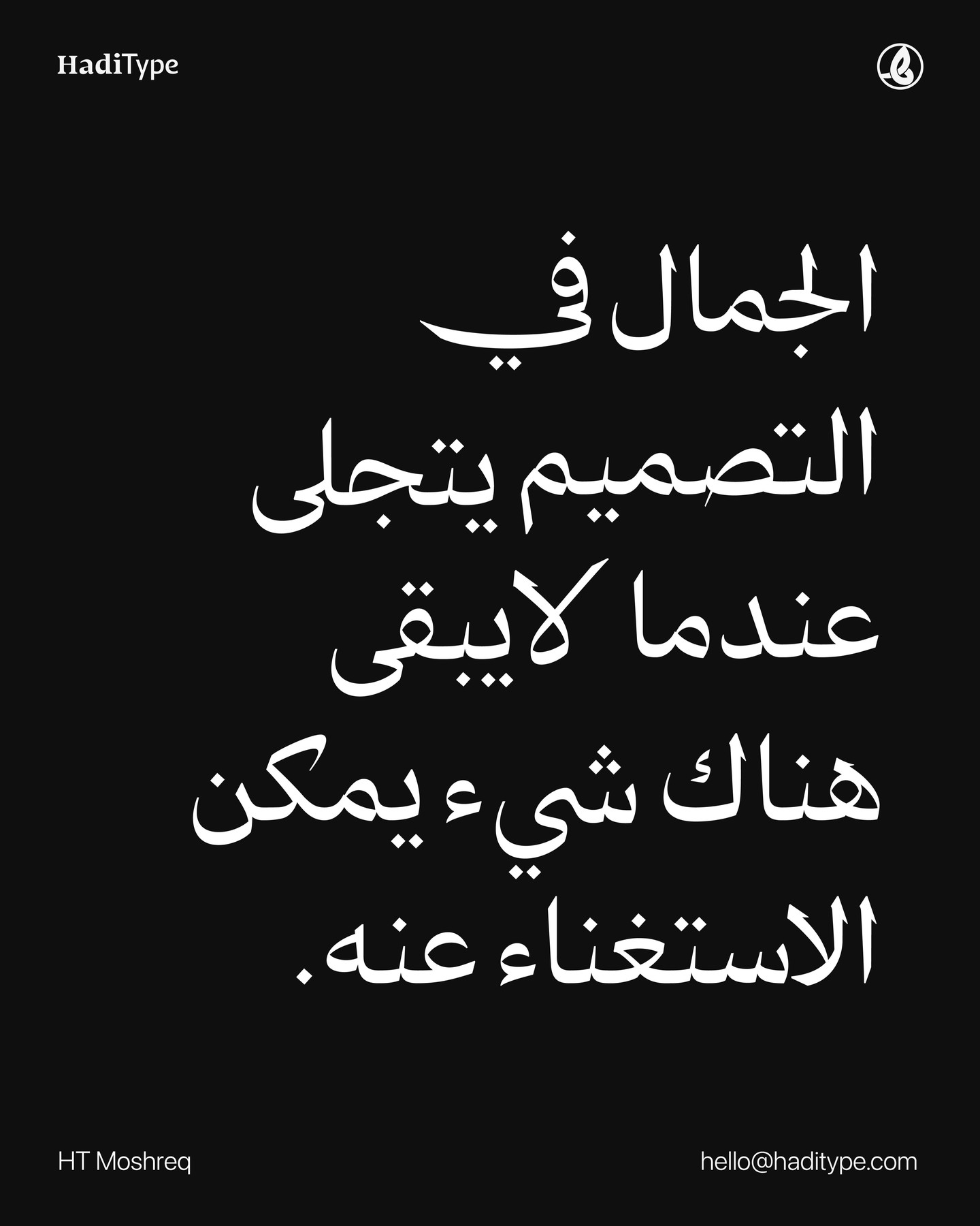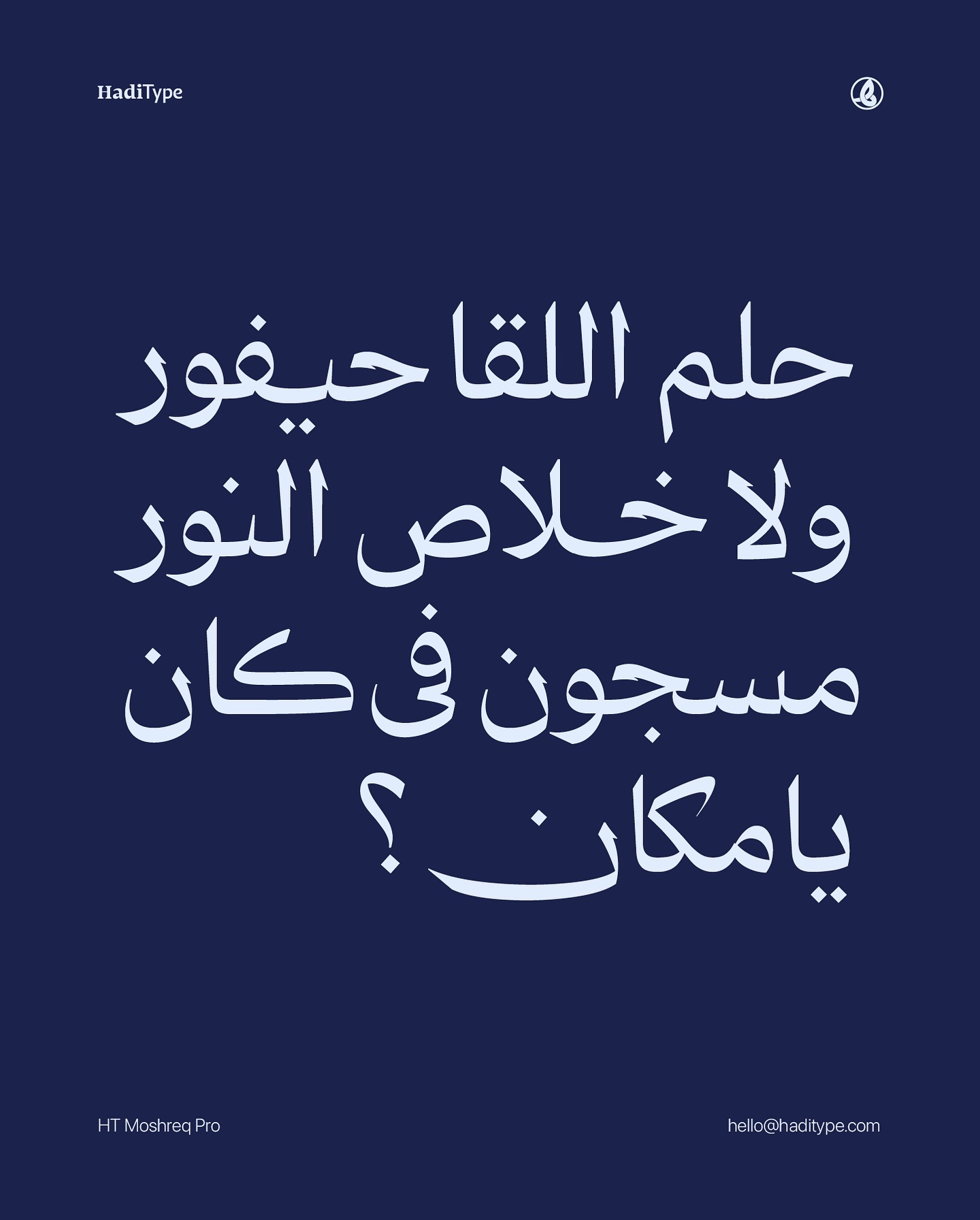HT Moshreq Pro is an elegant Arabic display typeface designed by Muhammed Hadi in early 2022. Originally released as a six-weight Arabic-only font, it was expanded in 2023 to include Latin script support.