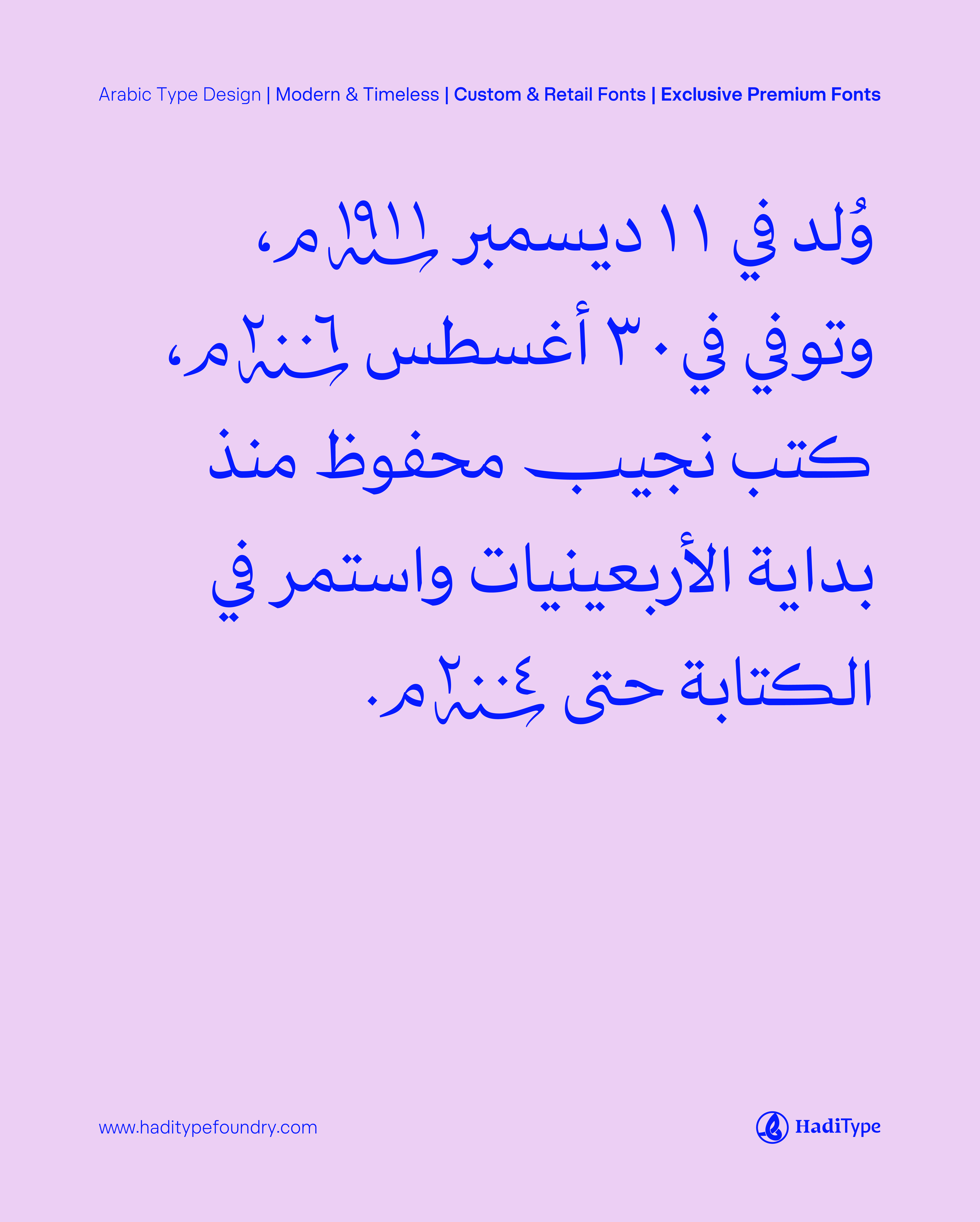 Designed by @mohammed_abdelhadi and released by @haditype_foundry, HT Rakeez is a modern interpretation of classical Naskh. It features sharp angular cuts, refined zulf terminals, and a robust 8-weight family tailored for editorial and interface applications.
