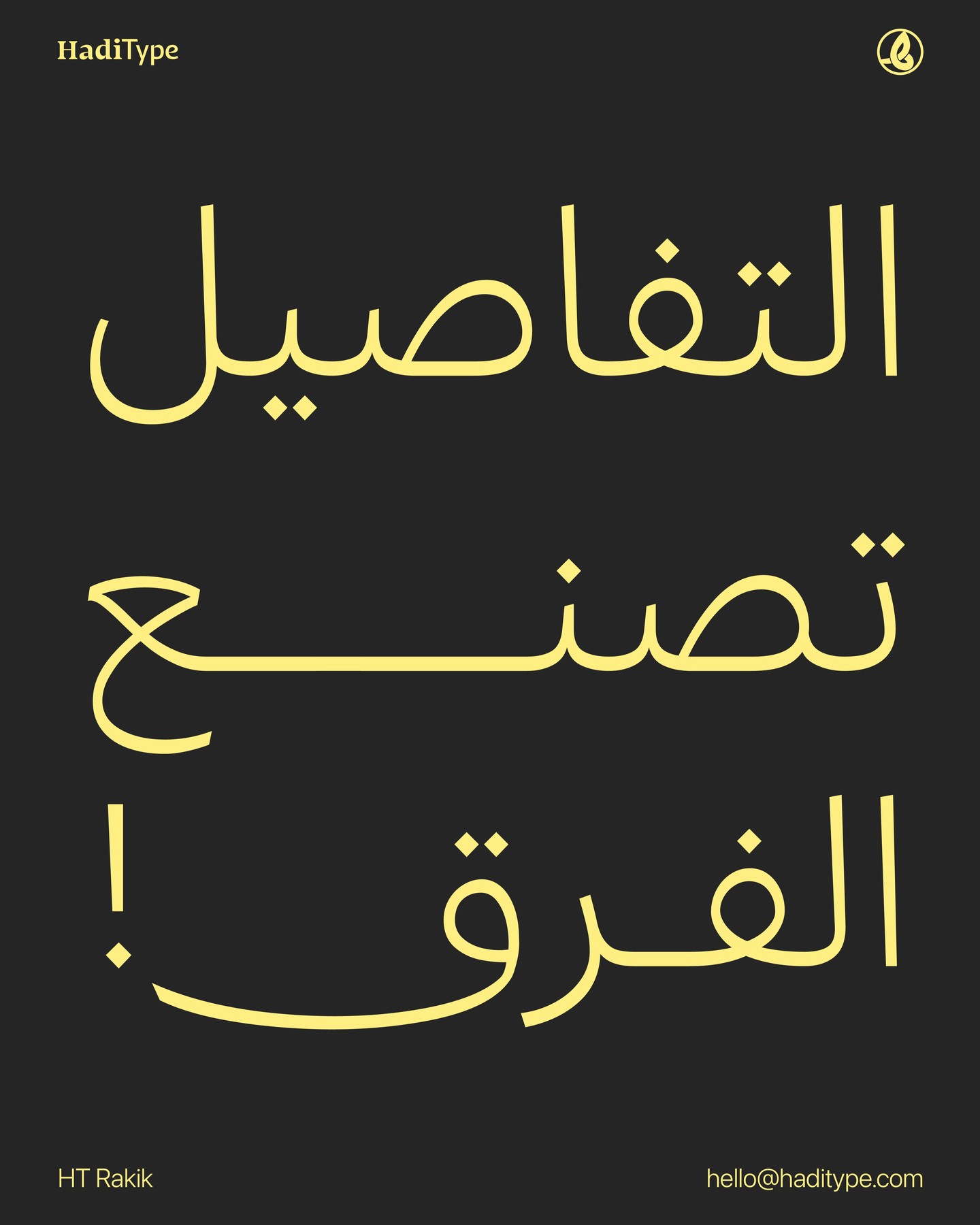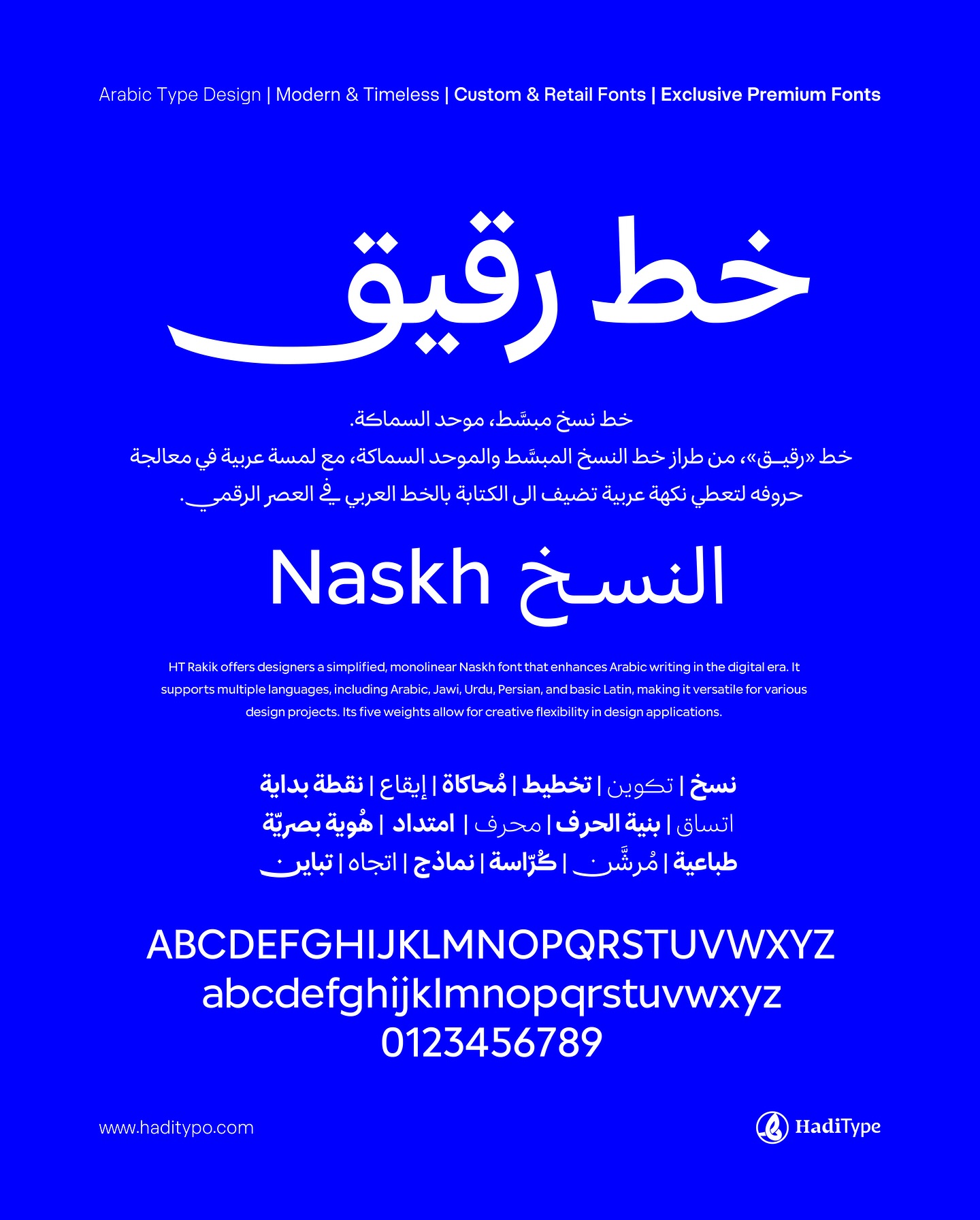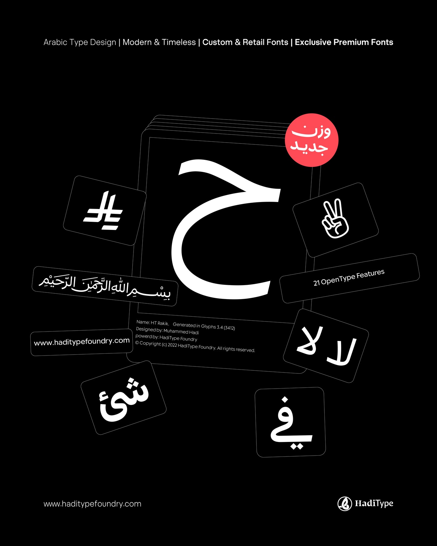 "HT Rakik" is a simplified, monolinear Naskh font with an Arabic essence in its letter design that enhances Arabic writing in the digital era. The font supports Arabic, Jawi, Urdu, Persian, and basic Latin languages, with five weights for design flexibility.