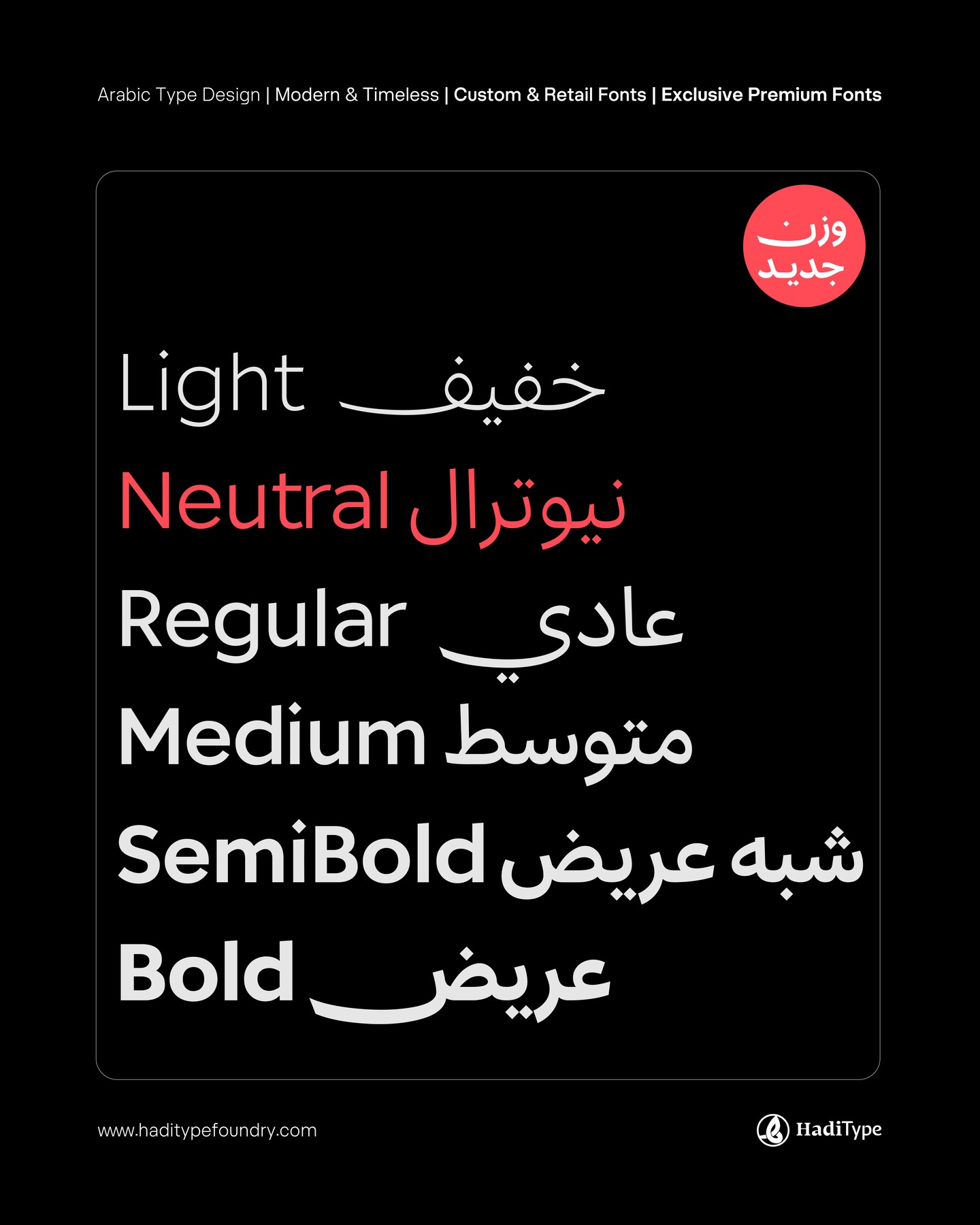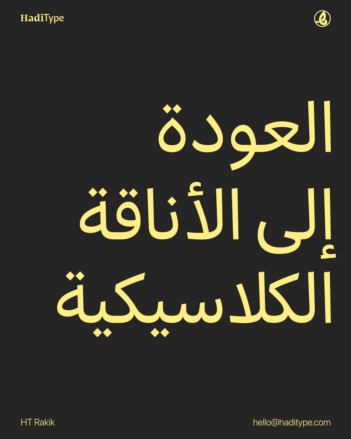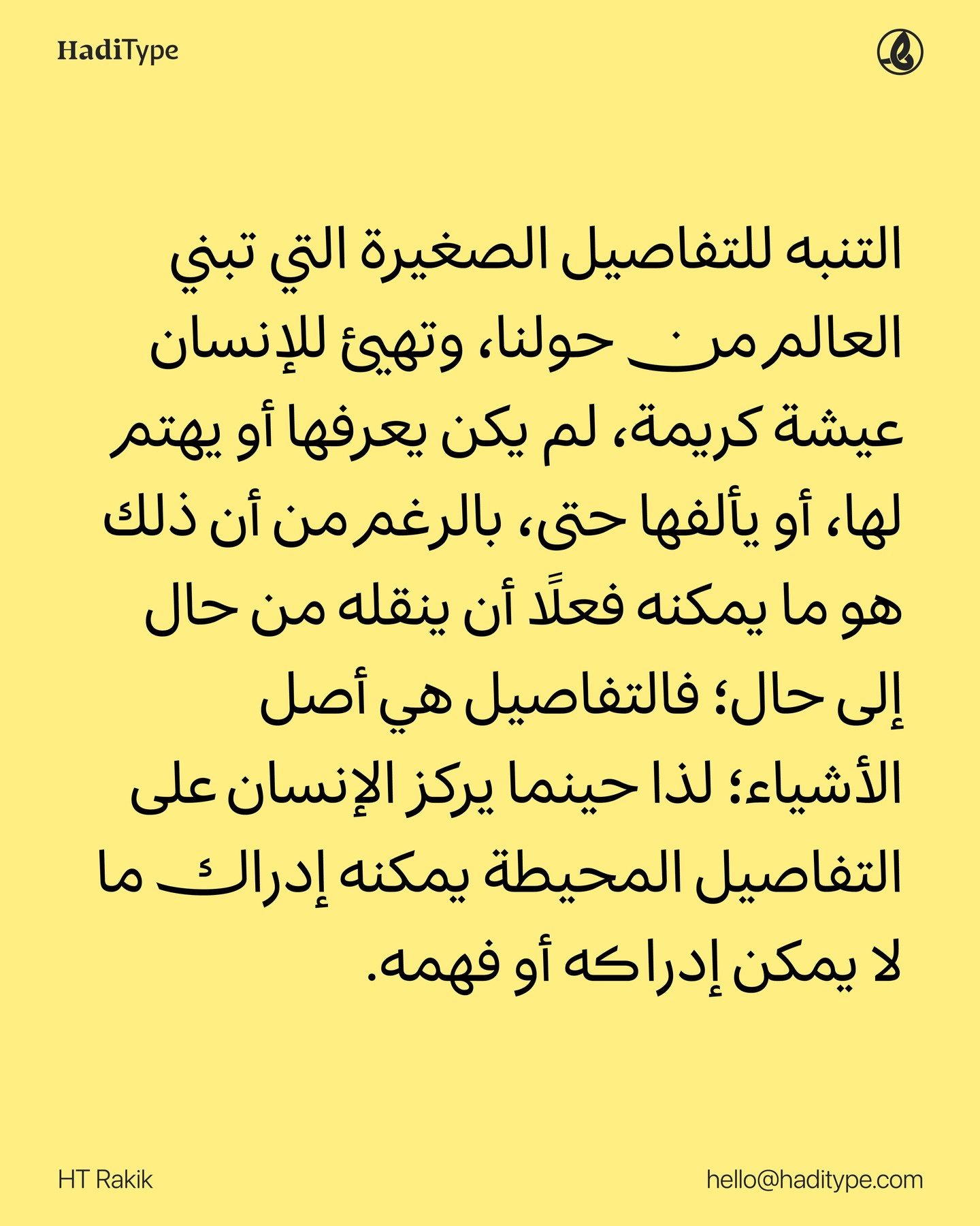 "HT Rakik" is a simplified, monolinear Naskh font with an Arabic essence in its letter design that enhances Arabic writing in the digital era. The font supports Arabic, Jawi, Urdu, Persian, and basic Latin languages, with five weights for design flexibility.